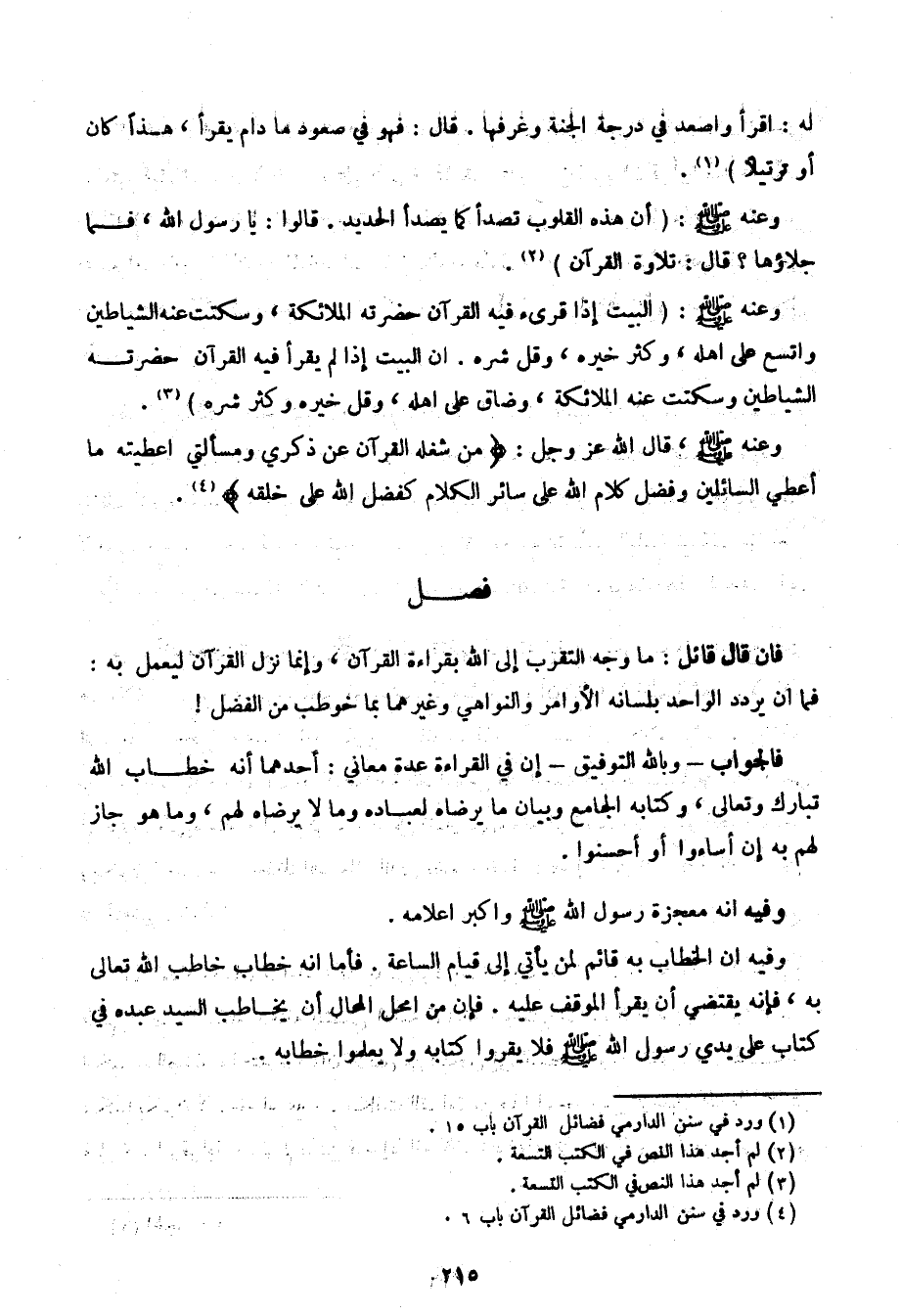 فإن قال قائل: ما وجه التقرب إلى الله بقراءة القرآن، وإنما نزل القرآن ليعمل به: فما أن يردد الواحد بلسانه الأوامر والنواهي وغيرهما بما خوطب من الفضل!