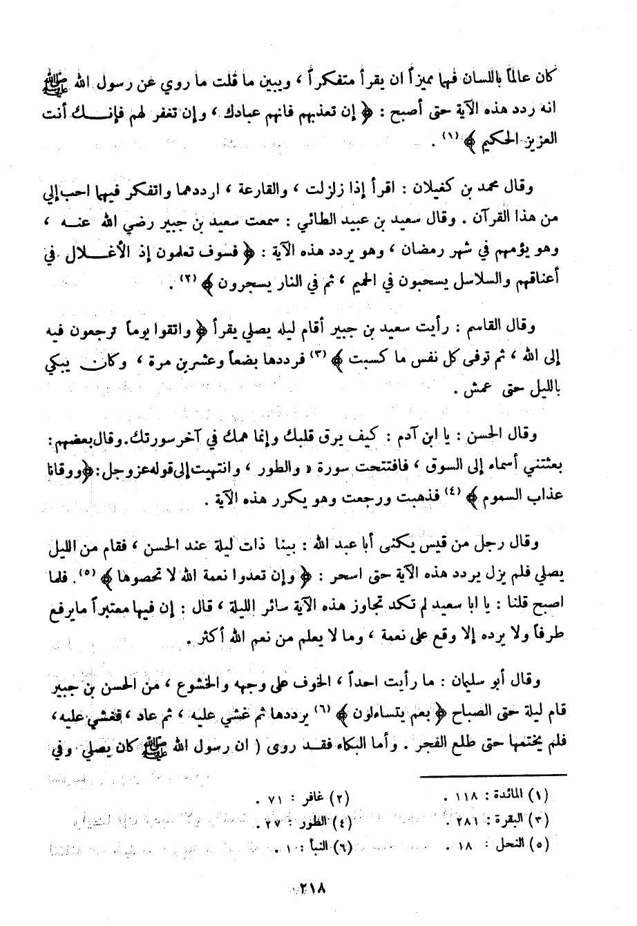 كان عالمًا باللسان فهما مميزًا أن يقرأ متفكرًا، ويبين ما قلت ما روي عن رسول الله صلى الله عليه وسلم أنه ردد هذه الآية حتى أصبح:} إن تعذبهم فإنهم عبادك، وإن تغفر لهم فإنك أنت العزيز الحكيم {.