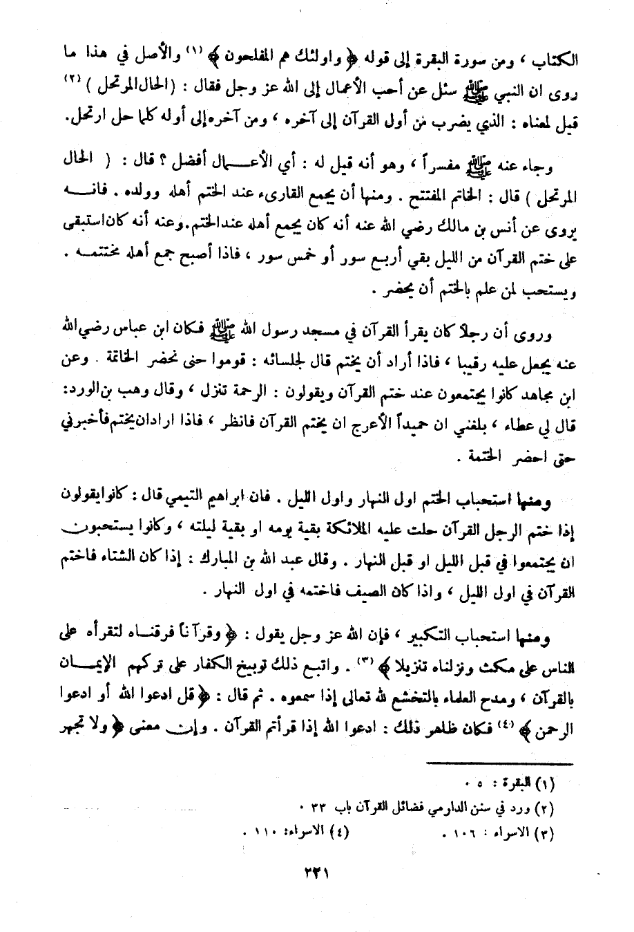 ومنها استحباب الختم أول النهار وأول الليل. فإن إبراهيم التيمي قال: كانوا يقولون إذا ختم الرجل القرآن حلت عليه الملائكة بقية يومه أو بقية ليلته، وكانوا يستحبون أن يجتمعوا في قبل الليل أو قبل النهار. وقال عبد الله بن المبارك: إذا كان الشتاء فاختم القرآن في أول الليل، وإذا كان الصيف فاختمه في أول النهار.