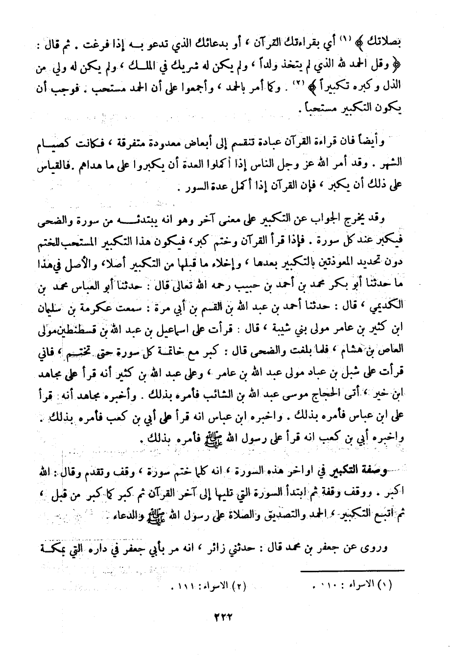 وصفة التكبير في أواخر هذه السورة، أنه كلما ختم سورة، وقف وتقدم وقال: الله أكبر. ووقف وقفة ثم ابتدأ السورة التي تليها إلى آخر القرآن ثم كبر كما كبر من قبل، ثم اتبع التكبير، الحمد والتصديق والصلاة على رسول الله صلى الله عليه وسلم والدعاء.