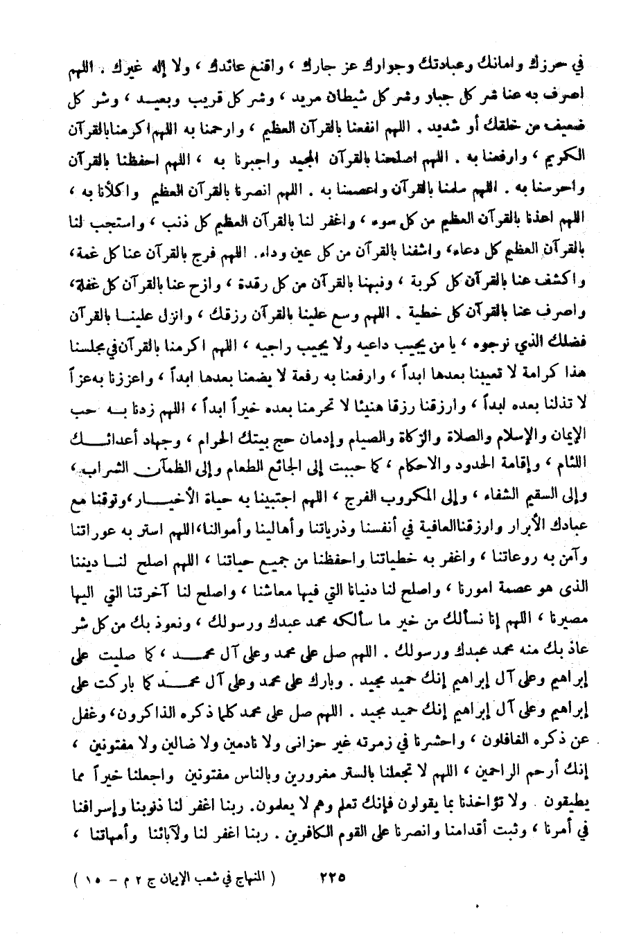 في حرزك وأمانك وعبادتك وجوارك عز جارك، واقنع عائدك، ولا إله غيرك. اللهم أصرف به عنا شر كل جبار وشر كل شيطان مريد، وشر كل قريب وبعيد، وشر كل ضعيف من خلقك أو شديد. اللهم انفعنا بالقرآن العظيم، وارحمنا به اللهم أكرمنا بالقرآن الكريم، وارفعنا به. اللهم أصلحنا بالقرآن المجيد وأجبرنا به، اللهم احفظنا بالقرآن واحرسنا به. اللهم سلمنا بالقرآن واعصمنا به. اللهم انصرنا بالقرآن العظيم واكلأنا به، اللهم أعذنا بالقرآن العظيم من كل سوء، واغفر لنا بالقرآن العظيم كل ذنب، واستجب لنا بالقرآن العظيم كل دعاء، واشفنا بالقرآن من كل عين وداء. اللهم فرج بالقرآن عنا كل غمة، واكشف عنا بالقرآن كل كربة، ونبهنا بالقرآن من كل رقدة، وأزح عنا بالقرآن كل غفلة، وأصرف عنا بالقرآن كل خطية. اللهم وسع علينا بالقرآن رزقك، وأنزل علينا بالقرآن فضلك الذي نرجوه، يا من يجيب داعيه ولا يجيب راجيه، اللهم أكرمنا بالقرآن في مجلسنا هذا كرامة لا تعيينا بعدها أبدًا، وارفعنا به رفعة لا يضعنا بعدها أبدًا، وأعززنا به عزًا لا تذلنا بعده أبدًا، وازرقنا رزقًا هنيئًا لا تحرمنا بعده خيرًا أبدًا، اللهم زدنا به حب الإيمان والإسلام والصلاة والزكاة والصيام وإدمان حج بيتك الحرام، وجهاد أعدائك اللئام، وإقامة الحدود والأحكام، كما حببت إلى الجائع الطعام وإلى الظمآن الشراب، وإلى السقيم الشفاء، وإلى المكروب الفرج، اللهم اجتبينا به حياة الأخيار، وتوفنا مع عبادك الأبرار وارزقنا العافية في أنفسنا وذرياتنا وأهالينا وأموالنا، اللهم استر به عوراتنا وآمن به روعاتنا، واغفر به خطياتنا واحفظنا من جميع حياتنا، اللهم أصلح لنا ديننا الذي هو عصمة أمورنا، وأصلح لنا دنيانا التي فيها معاشنا، وأصلح لنا آخرتنا التي إليها مصيرنا، اللهم إنا نسألك من خير ما سألكه محمد عبدك ورسولك، ونعوذ بك من كل شر عاذ بك منه محمد عبدك ورسولك. اللهم صل على محمد وعلى آل محمد، كما صليت على إبراهيم وعلى آل إبراهيم أنك حميد مجيد. وبارك على محمد وعلى آل محمد كما باركت على إبراهيم وعلى آل إبراهيم أنك حميد مجيد. اللهم صل على محمد كلما ذكره الذاكرون، وغفل عن ذكره الغافلون، واحشرنا في زمرته غير حزانى ولا نادمين ولا ضالين ولا مفتونين، إنك أرحم الراحمين، اللهم لا تجعلنا بالستر مغرورين وبالناس مفتونين واجعلنا خيرًا مما يطيقون. ولا تؤاخذنا بما يقولون فإنك تعلم وهم لا يعلمون. ربنا اغفر لنا ذنوبنا وإسرافنا في أمرنا، وثبت أقدامنا وانصرنا على القوم الكافرين. ربنا اغفر لنا ولآبائنا وأمهاتنا،