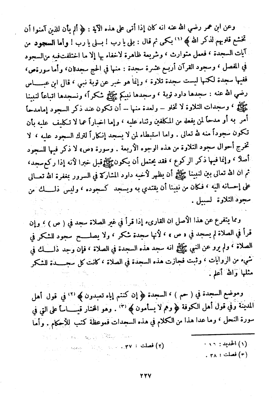 وعن ابن عمر رضي الله عنه أنه كان إذا أتى على هذه الآية:} ألم يأن للذين آمنوا أن تخشع قلوبهم لذكر الله {بكى ثم قال: بلى يا رب! بلى يا رب! وأما السجود من آيات السجدة، فعمل متوارث، وشريعة ظاهرة لإخفاء بها إلا ما اختلفت فيه من السجود في المفصل، وسجود القرآن أربع عشرة سجدة: منها في الحج سجدتان، وأما سورة ص، ففيها سجدة لكنها ليست سجدة تلاوة، وإنما هو خبر عن توبة نبي، قال ابن عباس رضي الله عنه: سجدها داود توبة، وسجدها نبيكم صلى الله عليه وسلم شكرًا، ونسجدها إتباعًا لنبينا صلى الله عليه وسلم، وسجدات التلاوة لا تخلو -ولعدة منها- أن تكون عند ذكر السجود إما مدحًا أمر به أو مدحًا لمن يفعله من المكلفين وثناء عليه، وإما أخبارًا عما لا تكليف عليه بأن تكون سجودًا منه لله تعالى. وأما استبطاء لمن لا يسجد إنكارًا لترك السجود عليه، لا تخرج أحوال سجود التلاوة من هذه الوجوه الأربعة. وسورة "ص" لا ذكر فيها للسجود أصلاً، وإنما فيها ذكر الركوع، فقد يحتمل أن يكون صلى الله عليه وسلم قبل خبرا لأنه إذا ركع سجد، ثم إن الله تعالى بين لنبينا صلى الله عليه وسلم أن يظهر لأخيه داود المشاركة في السرور بمغفرة الله تعالى على إحسانه إليه، فكان من نبينا أن يقتدي به ويسجد كسجوده، وليس ذلك من سجود التلاوة لسبيل.
