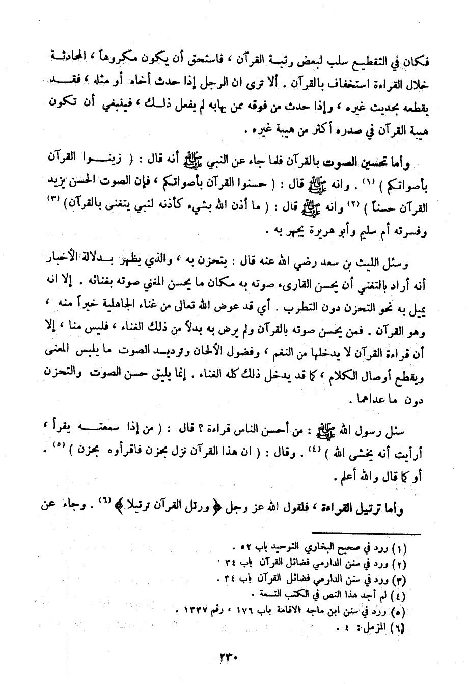 وسئل الليث بن سعد رضي الله عنه قال: يتحزن به، والذي يظهر بدلالة الأخبار أنه أراد بالتغني أن يحسن القارئ صوته به مكان ما يحسن المغني صوته بغنائه. إلا أنه يميل به نحو التخزن دون التطرب. أي قد عوض الله تعالى من غناء الجاهلية خيرًا منه، وهو القرآن. فمن يحسن صوته بالقرآن ولم يرض به بدلاً من ذلك الغناء، فليس منا، إلا أن قراءة القرآن لا يدخلها من النغم، وفضول الألحان وترديد الصوت ما يلبس المعنى ويقطع أوصال الكلام، كما قد يدخل ذلك كله الغناء. إنما يليق حسن الصوت والتحزن دون ما عداهما.