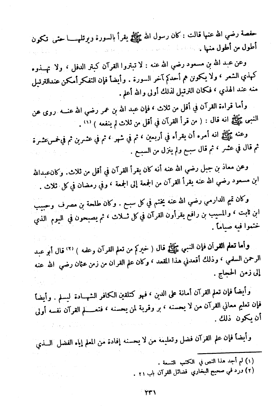 وعن معاذ بن جبل رضي الله عنه أنه كان يقرأ القرآن في أقل من ثلاث. وكان عبد الله ابن مسعود رضي الله عنه يقرأ القرآن من الجمعة إلى الجمعة، وفي رمضان في كل ثلاث.