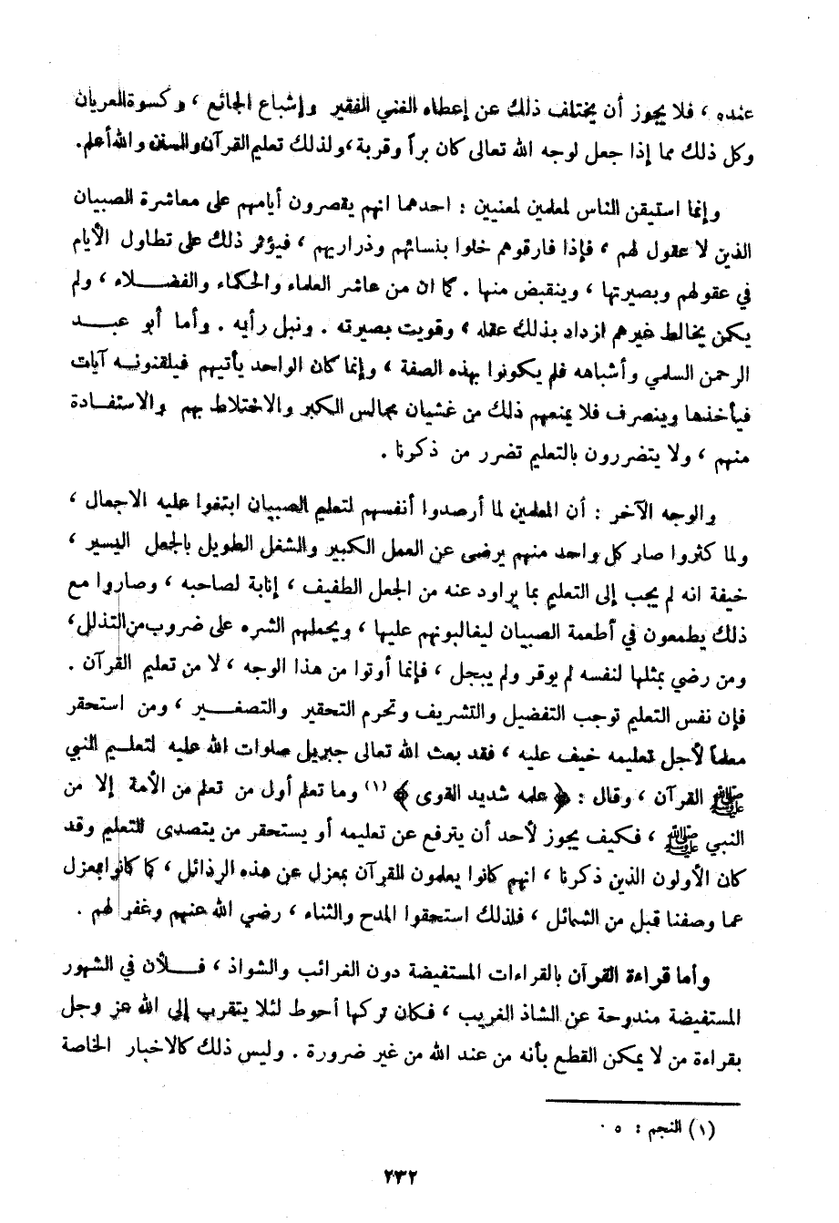 والوجه الآخر: أن المعلمين لما أرصدوا أنفسهم لتعليم الصبيان ابتغوا عليه الاجعال، ولما كثوا صار كل واحد منهم يرضى عن العمل الكبير والشغل الطويل بالجعل اليسير، خيفة أنه لم يجب إلى التعليم بما يراود عنه من الجعل الطفيف، إنابة لصاحبة، وصاروا مع ذلك يطمعون في أطعمة الصبيان ليغالبونهم عليها، ويحملهم الشره على ضروب من التذلل، ومن رضي بمثلها لنفسه لم يوقر ولم يبجل، فإنما أوتوا من هذا الوجه، لا من تعليم القرآن. فإن نفس التعليم توجب التفضيل والتشريف وتحرم التحقير والتصغير، ومن استحقر معلمًا لأجل تعليمه خيف عليه، فقد بعث الله تعالى جبريل صلوات الله عليه لتعليم النبي صلى الله عليه وسلم القرآن، وقال:} علمه شديد القوى {وما تعلم أول من تعلم من الأمة إلا من النبي صلى الله عليه وسلم، فكيف يجوز لأحد أن يترفع عن تعليمه أو يستحقر من يتصدى للتعليم وقد كان الأولون الذين ذكرنا، إنهم كانوا يعلمون للقرآن بمعزل عن هذه الرذائل، كما كانوا بمعزل عما وصفنا قبل من الشمائل، فلذلك استحقوا المدح والثناء، رضي الله عنهم وغفر لهم.