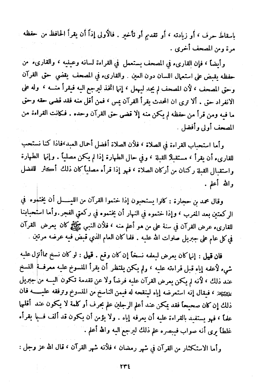 وأيضًا، فإن القارئ في المصحف يستعمل في القراءة لسانه وعينيه، والقارئ من حفظه يقبض على استعمال اللسان دون العين. والقارئ في المصحف يقضي حق القرآن وحق المصحف، لأن المصحف لم يجد ليهمل، إنما اتخذ ليرجع إليه فيقرأ منه، وله على الانفراد حق. ألا ترى أن المحدث يقرأ القرآن يمس، فمن أقل منه فقد قضى حقه وحق ما فيه ومن قرأ من حفظه لم يكن منه إلا قضى حق القرآن وحده. فكانت القراءة من المصحف أولى وأفضل.