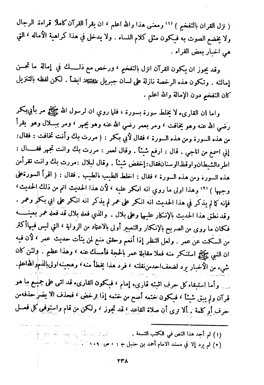 (نزل القرآن بالتفخيم) ومعنى هذا والله أعلم، أن يقرأ القرآن كاملاً قراءة الرجال ولا يخضع الصوت به فيكون مثل كلام النساء. ولا يدخل في هذا كراهية الأماله، التي هي أخبار بعض القراء.