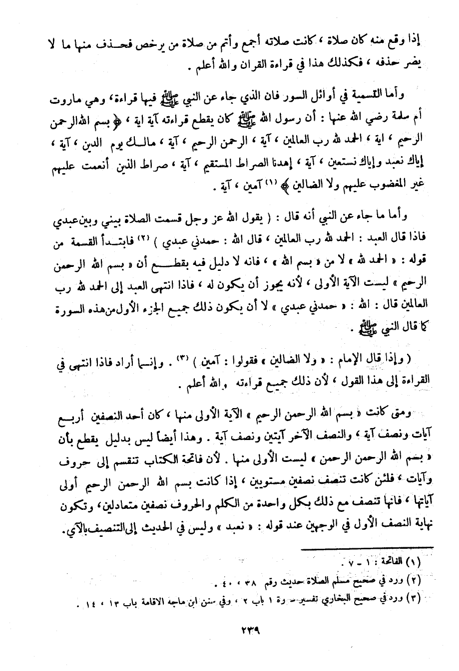 ومتى كانت "بسم الله الرحمن الرحيم" الآية الأولى منها، كان أحد النصفين أربع آيات ونصف آية، والنصف الآخر آيتين ونصف آية. وهذا أيضًا ليس بدليل يقطع بأن "بسم الله الرحمن الرحمن" ليست الأولى منها. لأن فاتحة الكتاب تنقسم إلى حروف وآيات، فلئن كانت تنصف نصفين مستويين، إذا كانت بسم الله الرحم الرحيم أولى آياتها، فإنها تنصف مع ذلك بكل واحدة من الكلم والحروف نصفين متعادلين، وتكون نهاية النصف الأول في الوجهين عند قوله: "نعبد" وليس في الحديث إلى التنصيف بالآي.