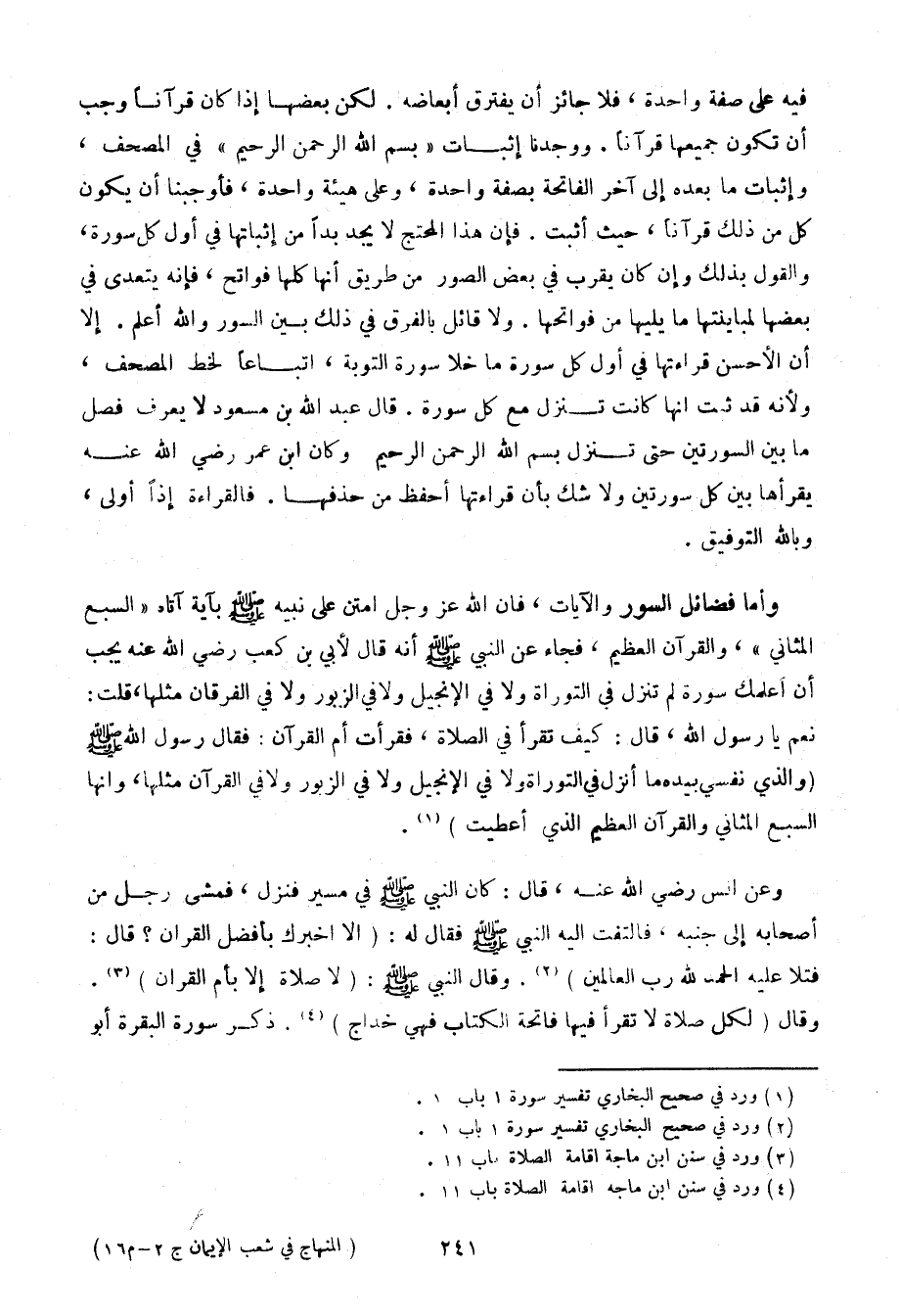 فيه على صفة واحدة، فلا جائز أن يفترق أبعاضه. لكن بعضها إذا كان قرآنًا وجب أن تكون جميعها قرآنًا. ووجدنا إثبات "بسم الله الرحمن الرحيم" في المصحف، وإثبات ما بعده إلى آخر الفاتحة بصفة واحدة، وعلى هيئة واحدة، فأوجبنا أن يكون كل من ذلك قرآنًا، حيث أثبت. فإن هذا المحتج لا يجد بدًا من إثباتها في أول كل سورة، والقول بذلك وإن كان يقرب في بعض الصور من طريق أنها كلها فواتح، فإنه يتعدى في بعضها لمباينتها ما يليها من فواتحها. ولا قائل بالفرق في ذلك بين السور والله أعلم. إلا أن الأحسن قراءتها في أول كل سورة ما خلا سورة التوبة، إتباعًا لخط المصحف، ولأنه قد ثبت أنها كانت تنزل مع كل سورة. قال عبد الله بن مسعود لا يعرف فصل ما بين السورتين حتى تنزل بسم الله الرحمن الرحيم وكان ابن عمر رضي الله عنه يقرأها بين كل سورتين ولا شك بأن قراءتها أحفظ من حذفها. فالقراءة إذًا أولى، وبالله التوفيق.