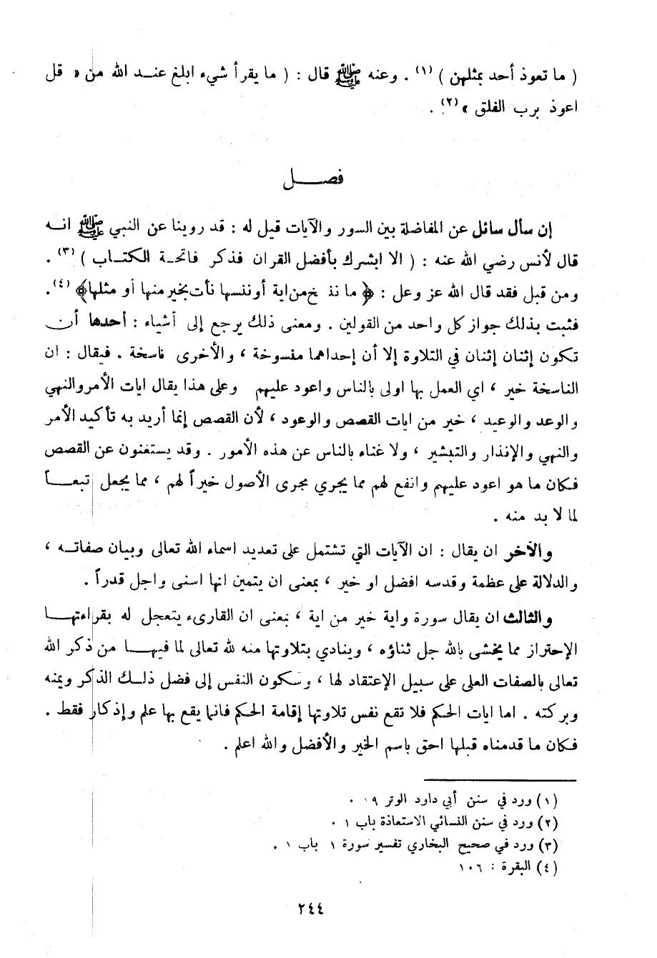 إن سأل سائل عن المفاضلة بين السور والآيات قيل له: قد روينا عن النبي صلى الله عليه وسلم أنه قال لأنس رضي الله عنه: (إلا أبشرك بأفضل القرآن فذكر فاتحة الكتاب). ومن قبل فقد قال الله عز وجل:} ما ننسخ من آية أو ننسها نأت بخير منها أو مثلها {. فثبت بذلك جواز كل واحد من القولين. ومعنى ذلك يرجع إلى أشياء: أحدها أن تكون اثنان اثنان في التلاوة إلا أن إحداهما منسوخة، والأخرى ناسخة. فيقال: إن الناسخة خير، أي العمل بها أولى بالناس وأعود عليهم وعلى هذا يقال آيات الأمر والنهي والوعد والوعيد، خير من آيات القصص والوعود، لأن القصص إنما أريد به تأكيد الأمر والنهي والإنذار والتبشير، ولا غناء بالناس عن هذه الأمور. وقد يستغنون عن القصص فكان ما هو أعود عليهم وأنفع لهم مما يجري مجرى الأصول خيرًا لهم، مما يجعل تبعًا لما لابد منه.