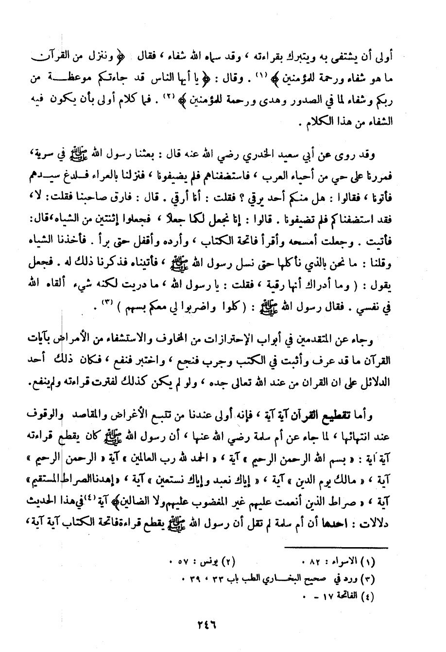 أولى أن يشتفى به ويتبرك بقراءته، وقد سماه الله شفاء، فقال:} وننزل من القرآن ما هو شفاء ورحمة للمؤمنين {. وقال:} يا أيها الناس قد جاءتكم موعظة من ربكم وشفاء لما في الصدور وهدى ورحمة للمؤمنين {. فما كلام أولى بأن يكون فيه الشفاء من هذا الكلام.