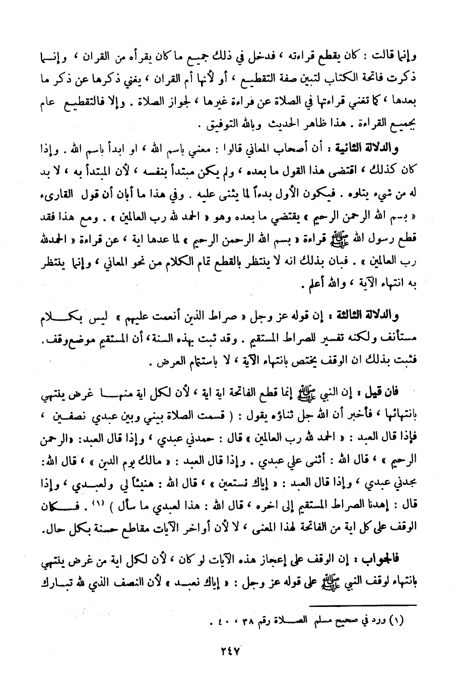 فإن قيل: إن النبي صلى الله عليه وسلم إنما قطع الفاتحة آية آية، لأن لكل آية منها غرض ينتهي بانتهائها، فأخبر أن الله جل ثناؤه يقول: (قسمت الصلاة بيني وبين عبدي نصفين، فإذا قال العبد: "الحمد لله رب العالمين" قال: حمدني عبدي، وإذا قال العبد: "الرحمن الرحيم"، قال الله: أثنى علي عبدي. وإذا قال العبد: "مالك يوم الدين"، قال الله: مجدني عبدي، وإذا قال العبد: "إياك نستعين"، قال الله: هنيئًا لي ولعبدي، وإذا قال: إهدنا الصراط المستقيم إلى آخره، قال الله: هذا لعبدي ما سأل). فكان الوقف على كل آية من الفاتحة لهذا المعنى، لا لأن أواخر الآيات مقاطع حسنة بكل حال.