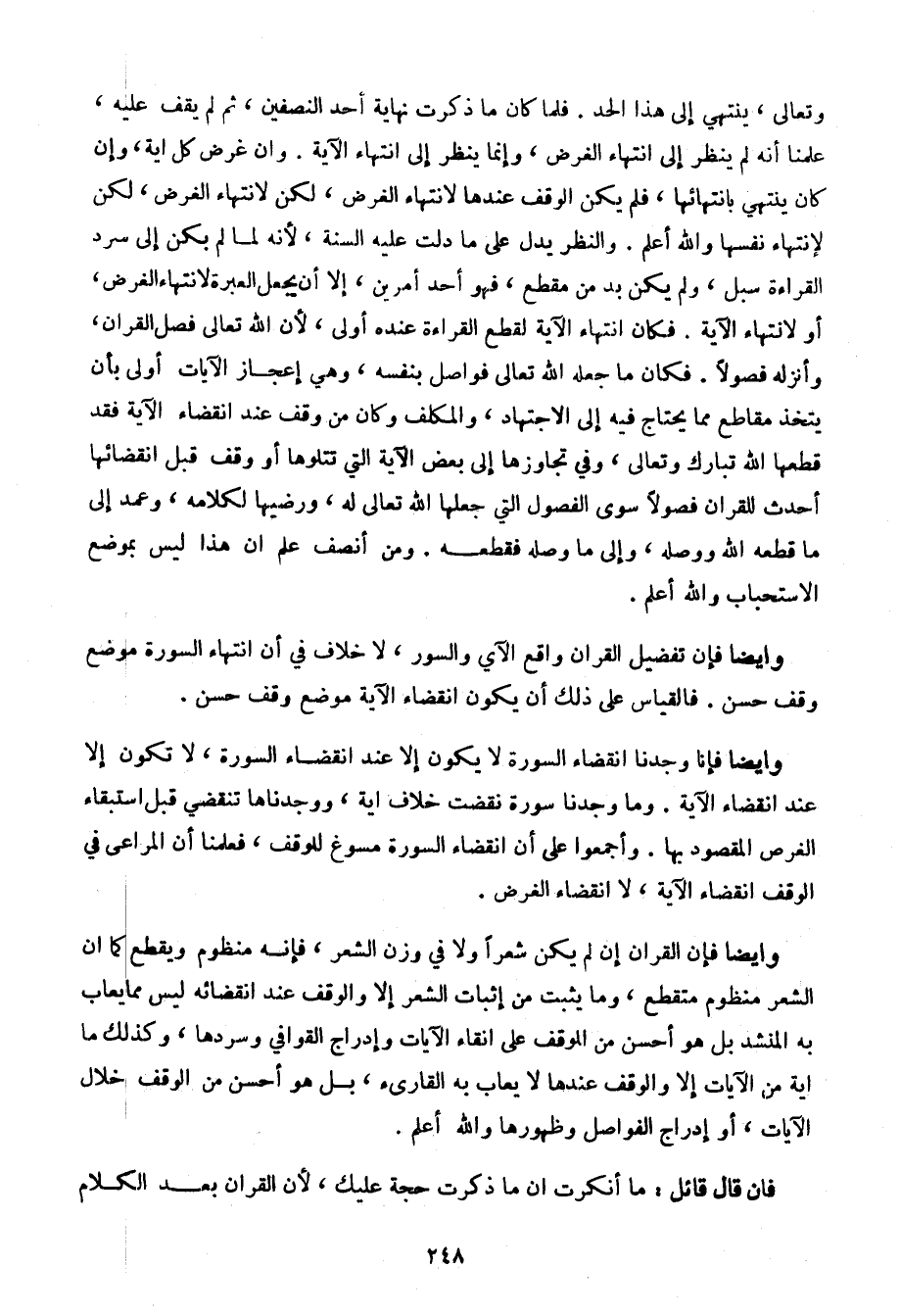وأيضا فإن القرآن إن لم يكن شعرًا ولا في وزن الشعر، فإنه منظوم ويقطع كما أن الشعر منظوم متقطع، وما يثبت من إثبات الشعر إلا والوقف عند انقضائه ليس مما يعاب به المنشد بل هو أحسن من الموقف على انقاء الآيات وإدراج القوافي وسردها، وكذلك ما آية من الآيات إلا والوقف عندها لا يعاب به القارئ، بل هو أحسن من الوقف خلال الآيات، أو إدراج الفواصل وظهورها والله أعلم.