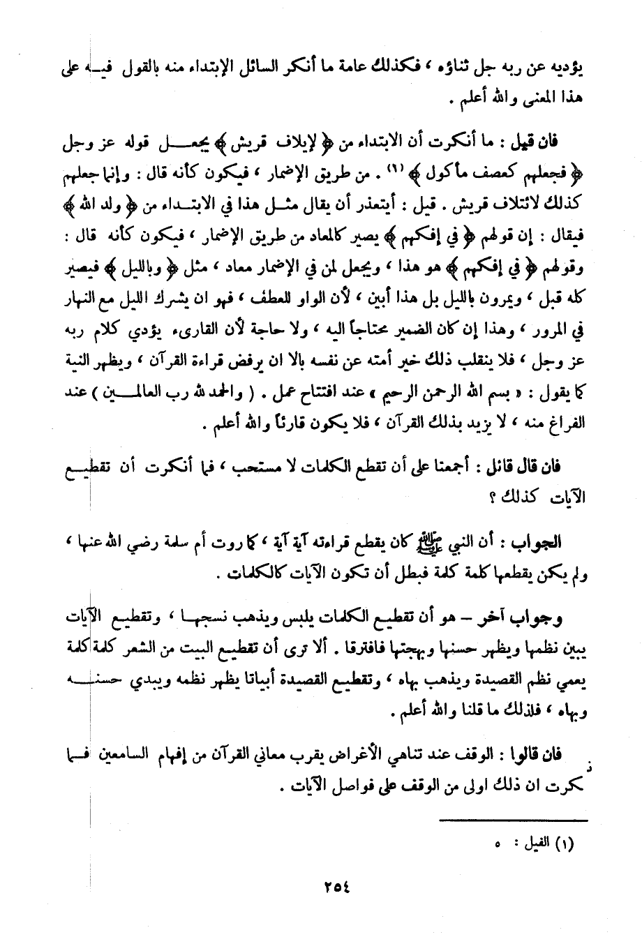 فإن قيل: ما أنكرت أن الابتداء من} لإيلاف قريش {يجعل قوله عز وجل} فجعلهم كعصف مأكول {. من طريق الإضمار، فيكون كأنه قال: وإنما جعلهم كذلك لائتلاف قريش. قيل: أيتعذر أن يقال مثل هذا في الابتداء من} ولد الله {فيقال: إن قولهم} في إفكهم {يصير كالمعاد من طريق الإضمار، فيكون كأنه قال: وقولهم} في إفكهم {هو هذا، ويجعل لمن في الإضمار معاد، مثل} وبالليل {فيصير كله قبل، ويمرون بالليل بل هذا أبين، لأن الواو للعطف، فهو أن يشرك الليل مع النهار في المرور، وهذا إن كان الضمير محتاجًا إليه، ولا حاجة لأن القارئ يؤدي كلام ربه عز وجل، فلا ينقلب ذلك خير أمته عن نفسه بالا إن يرفض قراءة القرآن، ويظهر النية كما يقول: "بسم الله الرحمن الرحيم" عند افتتاح عمل. (والحمد لله رب العالمين) عند الفراغ منه، لا يزيد بذلك القرآن، فلا يكون قارئًا والله أعلم.