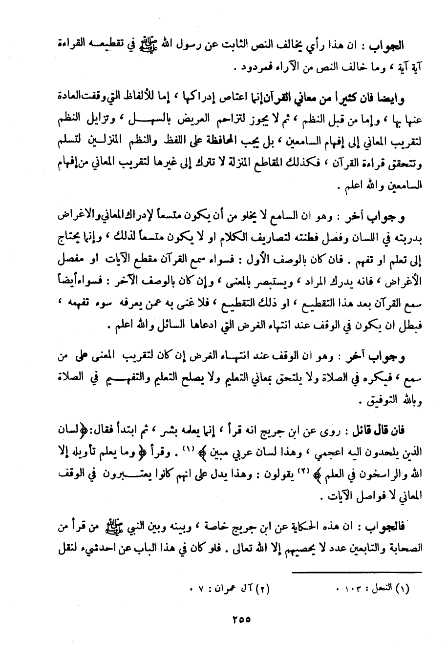 وجواب آخر: وهو أن السامع لا يخلو من أن يكون متسعًا لإدراك المعاني والأغراض بدربته في اللسان وفصل فطنته لتصاريف الكلام أو لا يكون متسعًا لذلك، وإنما يحتاج إلى تعلم أو تفهم. فإن كان بالوصف الأول: فسواء سمع القرآن مقطع الآيات أو مفصل الأغراض، فإنه يدرك المراد، ويستبصر بالمعنى، وإن كان بالوصف الآخر: فسواء أيضًا سمع القرآن بعد هذا التقطيع، أو ذلك التقطيع، فلا غنى به عمن يعرفه سوء تفهمه، فبطل أن يكون في الوقف عند انتهاء الغرض التي ادعاها السائل والله أعلم.