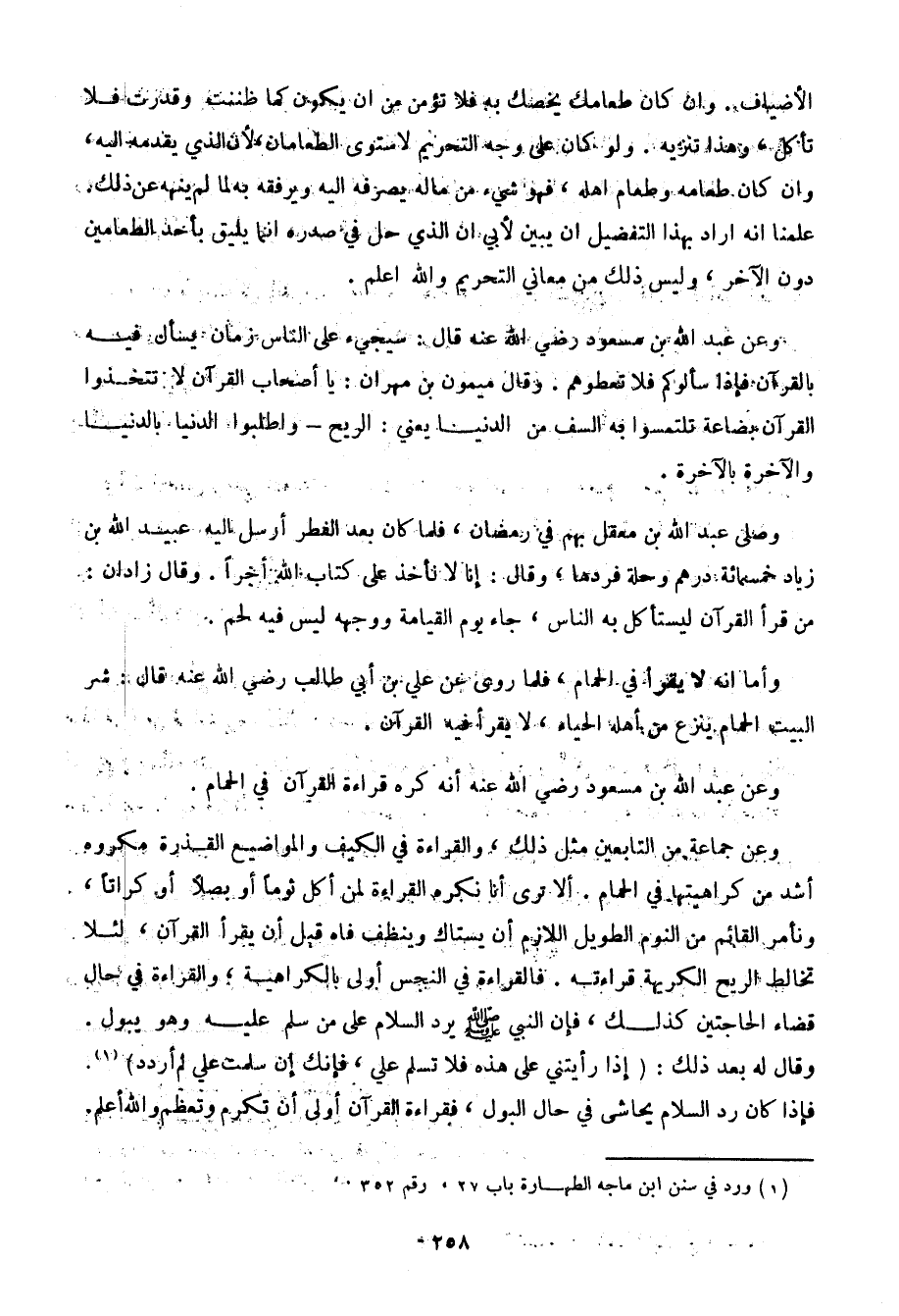 وعن جماعة من التابعين مثل ذلك، والقراءة في الكيف والمواضيع القذرة مكروه أشد من كراهيتها في الحمام. ألا ترى أنا بكره القراءة لمن أكل ثومًا أو بصلاً أو كراتًا، ونأمر القائم من النوم الطويل اللازم أن يستاك وينظف فاه قبل أن يقرأ القرآن، لئلا تخالط الريح الكريهة قراءته. فالقراءة في النجس أولى بالكراهية، والقراءة في حال قضاء الحاجتين كذلك، فإن النبي صلى الله عليه وسلم يرد السلام على من سلم عليه وهو يبول. وقال له بعد ذلك: (إذا رأيتني على هذه فلا تسلم علي، فإنك إن سلمت علي لم أردد). فإذا كان رد السلام يحاشى في حال البول، فقراءة القرآن أولى أن تكرم وتعظم والله أعلم.