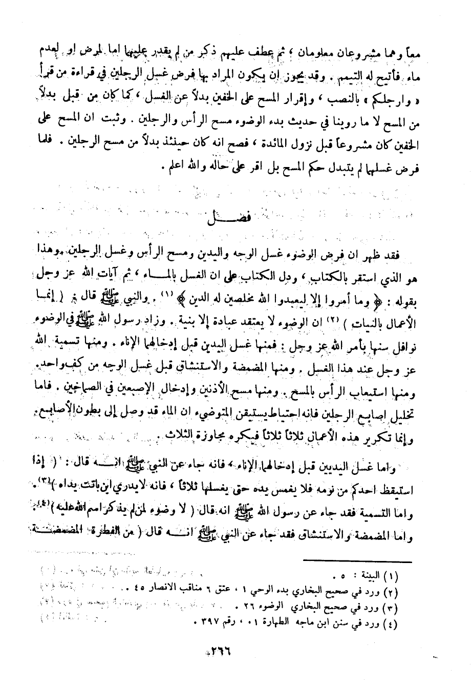 فقد ظهر أن فرض الوضوء غسل الوجه واليدين ومسح الرأس وغسل الرجلين. وهذا هو الذي استقر بالكتاب، ودل الكتاب على أن الغسل بالماء، ثم آيات الله عز وجل بقوله:} وما أمروا إلا ليعبدوا الله مخلصين له الدين {. والنبي صلى الله عليه وسلم قال: (إنما الأعمال بالنيات) أن الوضوء لا يعتقد عبادة إلا بنية. وزاد رسول الله صلى الله عليه وسلم في الوضوء نوافل سنها بأمر الله عز وجل: فمنها غسل اليدين قبل إدخالهما الإناء. ومنها تسمية الله عز وجل عند هذا الغسل. ومنها المضمضة والاستنشاق قبل غسل الوجه من كف واحد. ومنها استيعاب الرأس بالمسح. ومنها مسح الأذنين وإدخال الإصبعين في الصماخين. فإما تخليل أصابع الرجلين فإنه احتياط يستيقن المتوضئ أن الماء قد وصل إلى بطون الأصابع. وإنما تكرير هذه الأعمال ثلاثًا ثلاثًا فيكره مجاوزة الثلاث.