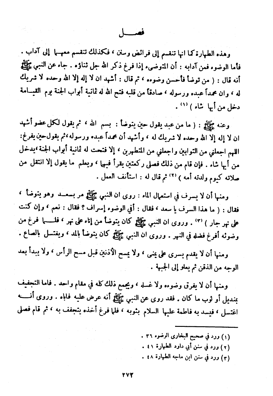 ومنها أن لا يسرف في استعمال الماء: روى أن النبي صلى الله عليه وسلم مر بسعد وهو يتوضأ، فقال: (ما هذا السرف يا سعد، فقال: أفي الوضوء إسراف؟ فقال: نعم، وإن كنت على نهر جار). وروى أن النبي صلى الله عليه وسلم كان يتوضأ من إناء على نهر، فلما فرغ من وضوئه أفرغ فضله في النهر. وروى أن النبي صلى الله عليه وسلم كان يتوضأ بالمد، ويغتسل بالصاع.