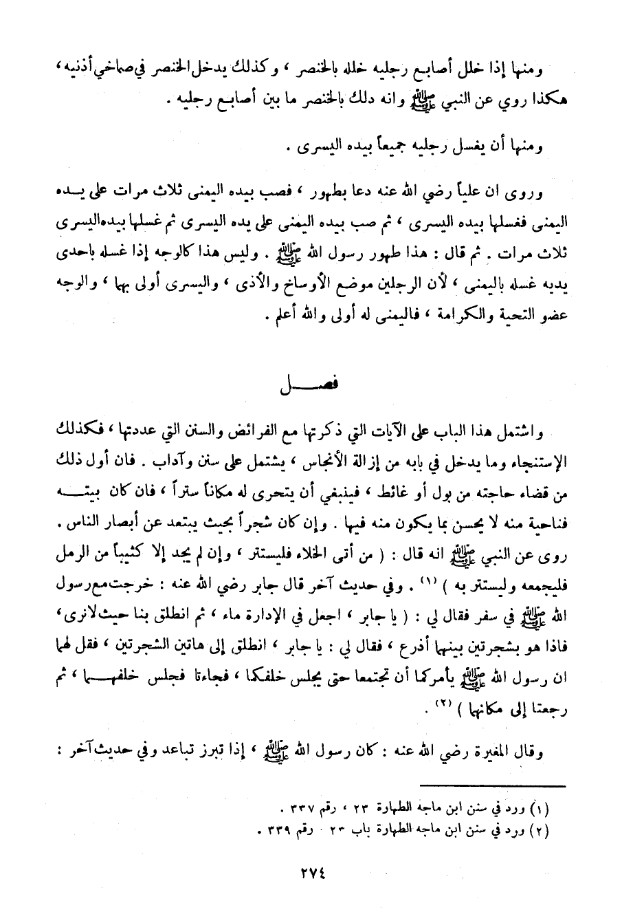واشتمل هذا الباب على الآيات التي ذكرتها مع الفرائض والسنن التي عددتها، فكذلك الاستنجاء وما يدخل في بابه من إزالة الأنجاس، يشتمل على سنن وآداب. فإن أول ذلك من قضاء حاجته من بول أو غائط، فينبغي أن يتحرى له مكانًا سترًا، فإن كان بيته فناحية منه لا يحسن بما يكون منه فيها. وإن كان شجرًا بحيث يبتعد عن أبصار الناس. روى عن النبي صلى الله عليه وسلم أنه قال: (من أتى الخلاء فليستتر، وإن لم يجد إلا كثيبًا من الرمل فليجمعه وليستتر به). وفي حديث آخر قال جابر رضي الله عنه: خرجت مع رسول الله صلى الله عليه وسلم في سفر فقال لي: (يا جابر، اجعل في الإدارة ماء، ثم انطلق بنا حيث لا نرى، فإذا هو بشجرتين بينهما أذرع، فقال لي: يا جابر، انطلق إلى هاتين الشجرتين، فقل لهما إن رسول الله صلى الله عليه وسلم يأمركما أن تجتمعا حتى يجلس خلفكما، فجاءتا فجلس خلفهما، ثم رجعتا إلى مكانهما).