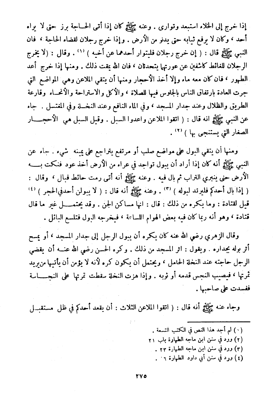إذا خرج إلى الخلاء استبعد وتوارى. وعنه صلى الله عليه وسلم كان إذا أتى الحاجة برز حتى لا يراه أحد، وكان لا يرفع ثيابه حتى يدنو من الأرض. وإذا خرج رجلان لقضاء الحاجة، فإن النبي صلى الله عليه وسلم قال: (إن خرج رجلان فليتوار أحدهما عن أخيه). وقال: (لا يخرج الرجلان للغائط كاشفين عن عورتهما يتحدثان، فإن الله يمقت ذلك. ومنها إذا خرج أعد الطهور، فإن كان معه ماء وإلا أخذ الأحجار ومنها أن يتقي الملاعن وهي المواضع التي جرت العادة بارتفاق الناس بالجلوس فيها للصلاة، والأكل والاستراحة والأنحاء وقارعة الطريق والظلال وعند جدار المسجد، وفي الماء النافع وعند النخلة وفي المغتسل. جاء عن النبي صلى الله عليه وسلم أنه قال: (اتقوا الملاعن وأعدوا السبل. وقيل السبل هي الأحجار الصغار التي يستنجى بها).