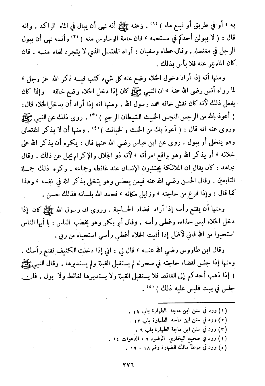 وقال ابن طاووس رضي الله عنه، قال لي: إني إذا دخلت الكنيف تقنع رأسك. ومنها إذا جلس لقضاء حاجته في صحراء لم يستقبل القبلة ولم يستدبرها. وقال النبي صلى الله عليه وسلم (إذا ذهب أحدكم إلى الغائط فلا يستقبل القبلة ولا يستدبرها لغائط ولا بول. فإن جلس في بيت فليس عليه ذلك).