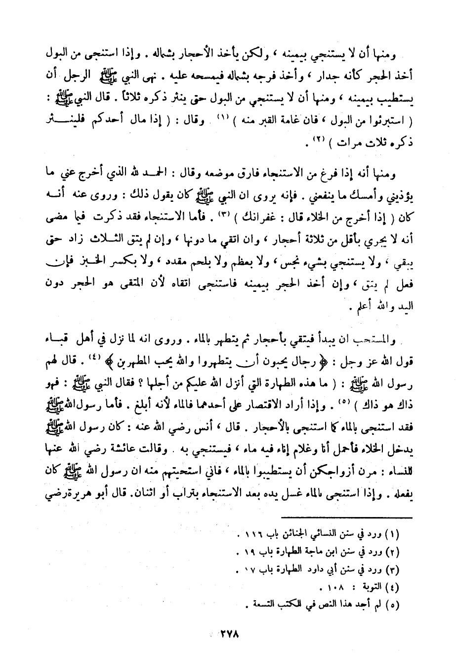 ومنها أنه إذا فرغ من الاستنجاء فارق موضعه وقال: الحمد لله الذي أخرج عني ما يؤذيني وأمسك ما ينفعني. فإنه يروى أن النبي صلى الله عليه وسلم كان يقول ذلك: وروى عنه أنه كان (إذا أخرج من الخلاء قال: غفرانك). فأما الاستنجاء فقد ذكرت فيما مضى أنه لا يجري بأقل من ثلاثة أحجار، وإن اتقي ما دونها، وإن لم يتق الثلاث زاد حتى يبقي، ولا يستنجي بشيء نجس، ولا بعظم ولا بلحم مقدد، ولا بكسر الخبز فإن فعل لم يتق، وإن أخذ الحجر بيمينه فاستنجى اتقاه لأن المتقى هو الحجر دون اليد والله أعلم.