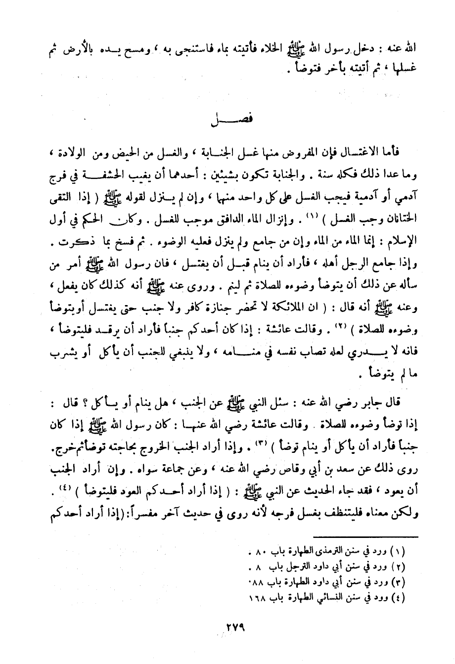فأما الاغتسال فإن المفروض منها غسل الجنابة، والغسل من الحيض ومن الولادة، وما عدا ذلك فكله سنة. والجنابة تكون بشيئين: أحدهما أن يغيب الحشفة في فرج آدمي أو آدمية فيجب الغسل على كل واحد منهما، وإن لم ينزل لقوله صلى الله عليه وسلم (إذا التقى الختانان وجب الغسل). وإنزال الماء الدافق موجب للغسل. وكان الحكم في أول الإسلام: إنما الماء من الماء وإن من جامع ولم ينزل فعليه الوضوء. ثم فسخ بما ذكرت. وإذا جامع الرجل أهله، فأراد أن ينام قبل أن يغتسل، فإن رسول الله صلى الله عليه وسلم أمر من سأله عن ذلك أن يتوضأ وضوءه للصلاة ثم لينم. وروى عنه صلى الله عليه وسلم أنه كذلك كان يفعل، وعنه صلى الله عليه وسلم أنه قال: (إن الملائكة لا تحضر جنازة كافر ولا جنب حتى يغتسل أو يتوضأ وضوءه للصلاة). وقالت عائشة: إذا كان أحدكم جنبًا فأراد أن يرقد فليتوضأ، فإنه لا يدري لعله تصاب نفسه في منامه، ولا ينبغي للجنب أن يأكل أو يشرب ما لم يتوضأ.