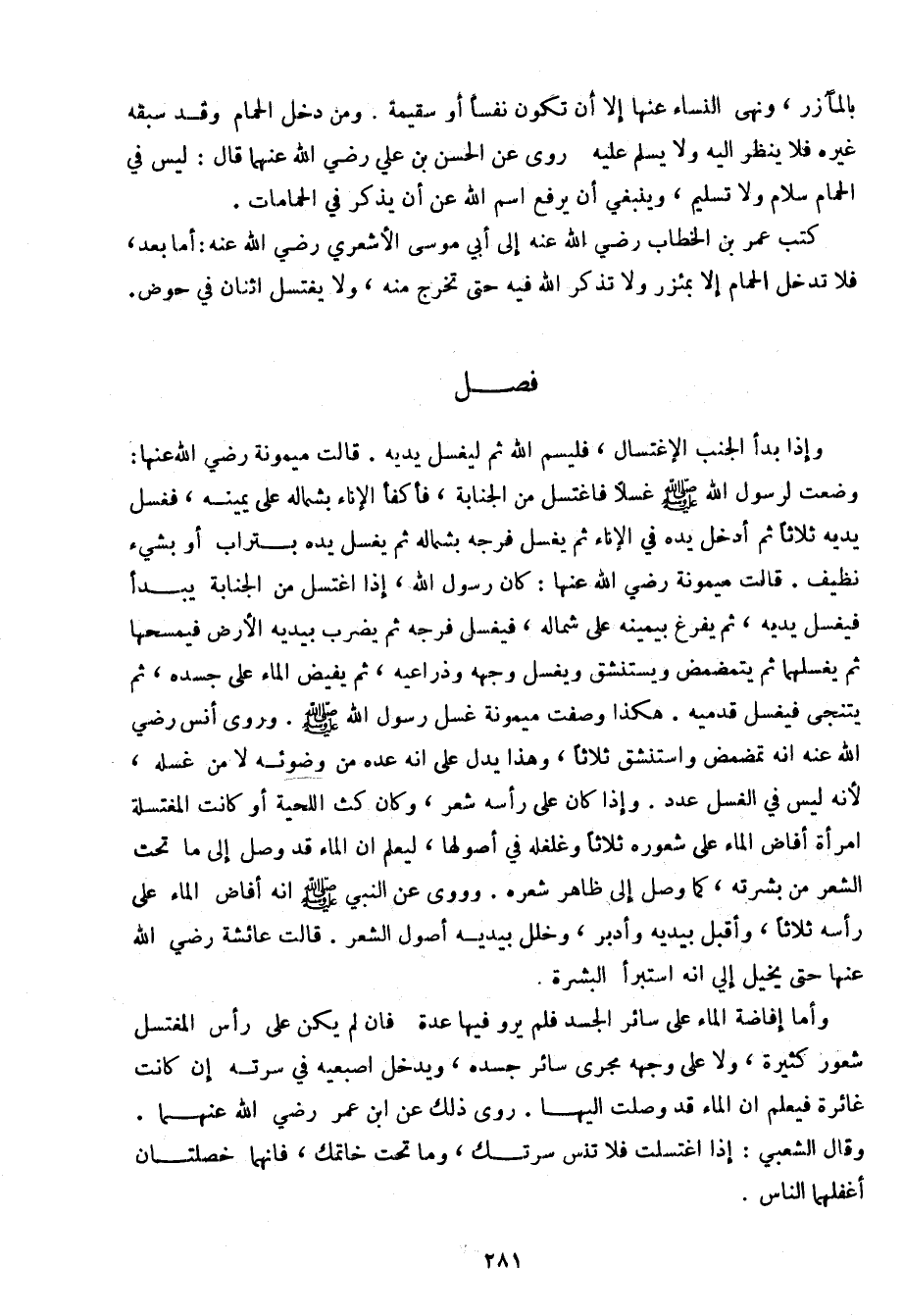 وأما إفاضة الماء على سائر الجسد فلم يرو فيها عدة فإن لم يكن على رأس المغتسل شعور كثيرة، ولا على وجهه مجرى سائر جسده، ويدخل إصبعيه في سرته إن كانت غائرة فيعلم أن الماء قد وصلت إليها. روى ذلك عن ابن عمر رضي الله عنهما. وقال الشعبي: إذا اغتسلت فلا تنس سرتك، وما تحت خاتمك، فإنهما خصلتان أغفلهما الناس.