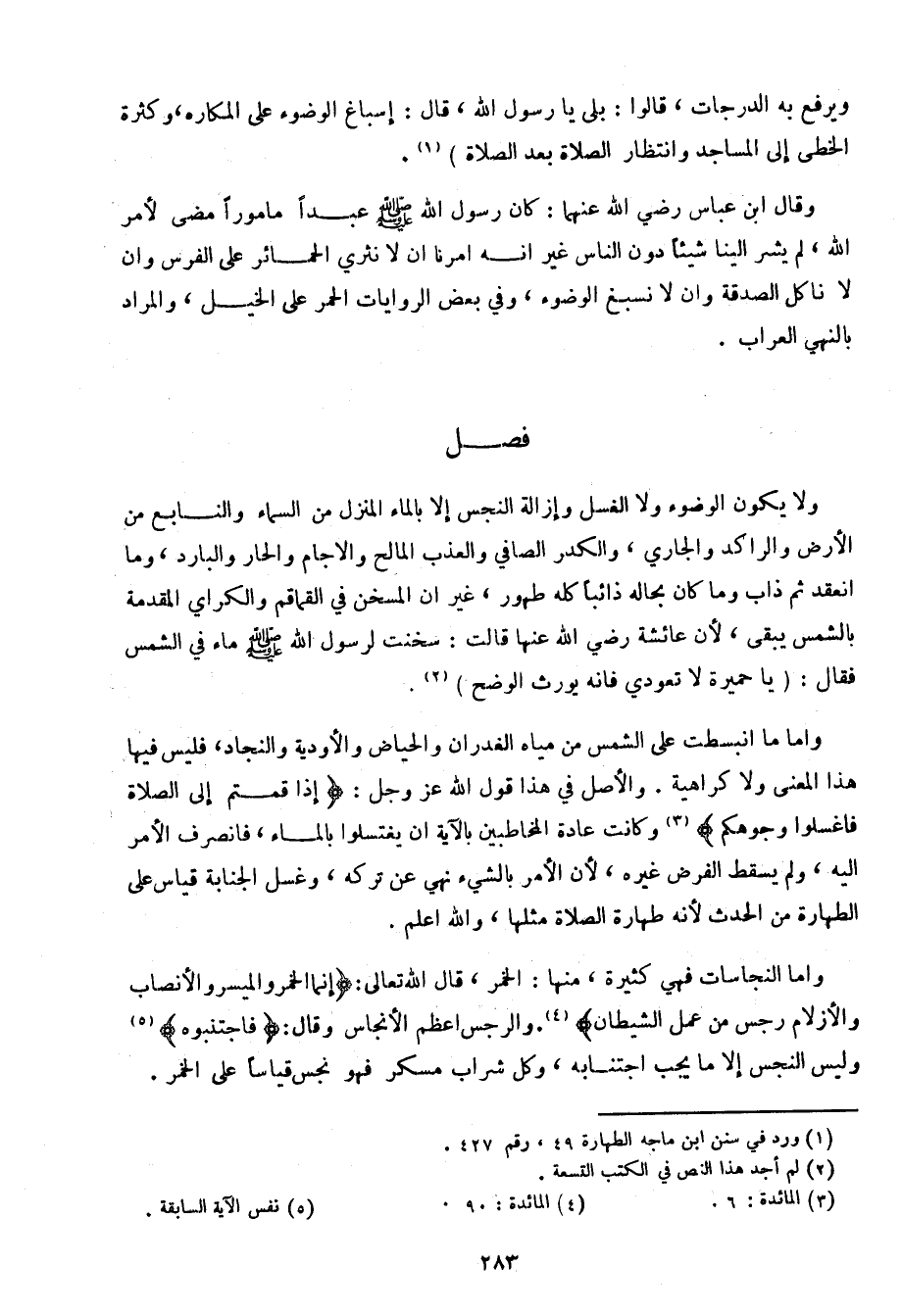 وأما ما انبسطت على الشمس من مياه الغدران والحياض والأودية والنجاد، فليس فيها هذا المعنى ولا كراهية. والأصل في هذا قول الله عز وجل:} إذا قمتم إلى الصلاة فاغسلوا وجوهكم {وكانت عادة المخاطبين بالآية أن يغتسلوا بالماء، فانصرف الأمر إليه، ولم يسقط الفرض غيره، لأن الأمر بالشيء نهي عن تركه، وغسل الجنابة قياس على الطهارة من الحدث لأنه طهارة الصلاة مثلها، والله أعلم.