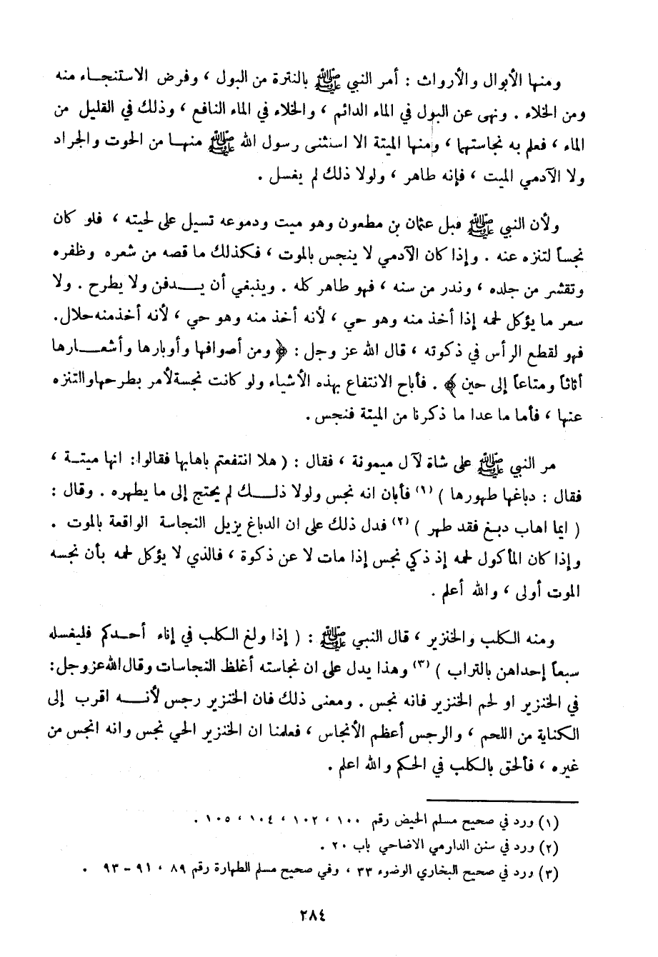 ومنها الأبوال والأرواث: أمر النبي صلى الله عليه وسلم بالنترة من البول، وفرض الاستنجاء منه ومن الخلاء. ونهي عن البول في الماء الدائم، والخلاء في الماء النافع، وذلك في القليل من الماء، فعلم به نجاستهما، ومنها الميتة إلا استثنى رسول الله صلى الله عليه وسلم منها من الحوت والجراد ولا الآدمي الميت، فإنه طاهر، ولولا ذلك لم يغسل.