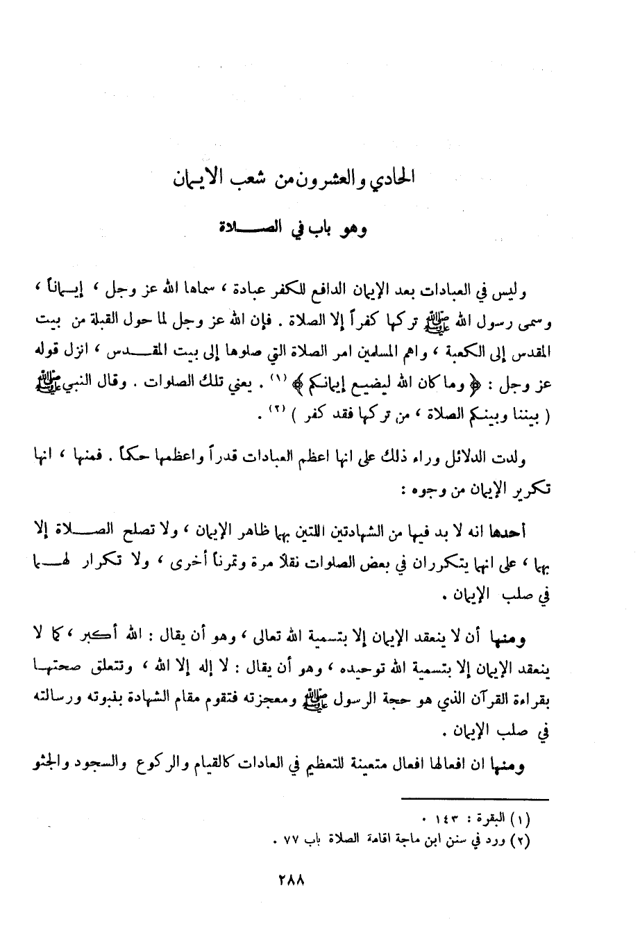 وليس في العبادات بعد الإيمان الدافع للكفر عبادة، سماها الله عز وجل، إيمانًا، وسمى رسول الله صلى الله عليه وسلم تركها كفرًا إلا الصلاة. فإن الله عز وجل لما حول القبلة من بيت المقدس إلى الكعبة، وأهم المسلمين أمر الصلاة التي صلوها إلى بيت المقدس، أنزل قوله عز وجل:} وما كان الله ليضيع إيمانكم {. يعني تلك الصلوات. وقال النبي صلى الله عليه وسلم (بيننا وبينكم الصلاة، من تركها فقد كفر).