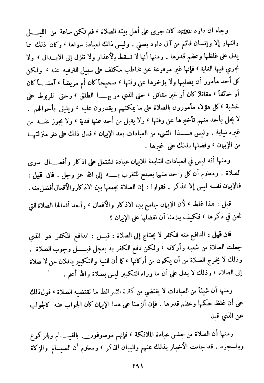 وجاء أن داود عليه السلام كان جرى على أهل بيته الصلاة، فلم تكن ساعة من الليل والنهار إلا وإنسان قائم من آل داود يصلي. وليس ذلك لعبادة سواها، وكان ذلك مما يدل على غلظها وعظم قدرها. ومنها أنها لا تسقط بالأعذار ولا تنزل إلى الإبدال، ولا تجري فيها الغاية، فإنها غير مرفوعة عن مخاطب مكلف على سبيل الترفيه عنه، ولكن كل أحد مأمور أن يصليها ولا يؤخرها عن وقتها، صحيحًا كان أم مريضًا، آمنًا كان أو خائفًا، مقاتلاً كان أو غير مقاتل، حتى الذي مر بها الطلق، وحتى المربوط على خشبة، كل هؤلاء مأمورون بالصلاة على ما يمكنهم ويقدرون عليه، ويليق بأحوالهم. لا يحل بأحد منهم تأخيرها عن وقتها، ولا يقبل من أحد عنها فدية، ولا يجوز عنه من غيره نيابة. وليس هذا الشيء من العبادات بعد الإيمان، فدل ذلك على دنو منزلتها من الإيمان، وفضلها بذلك على غيرها.