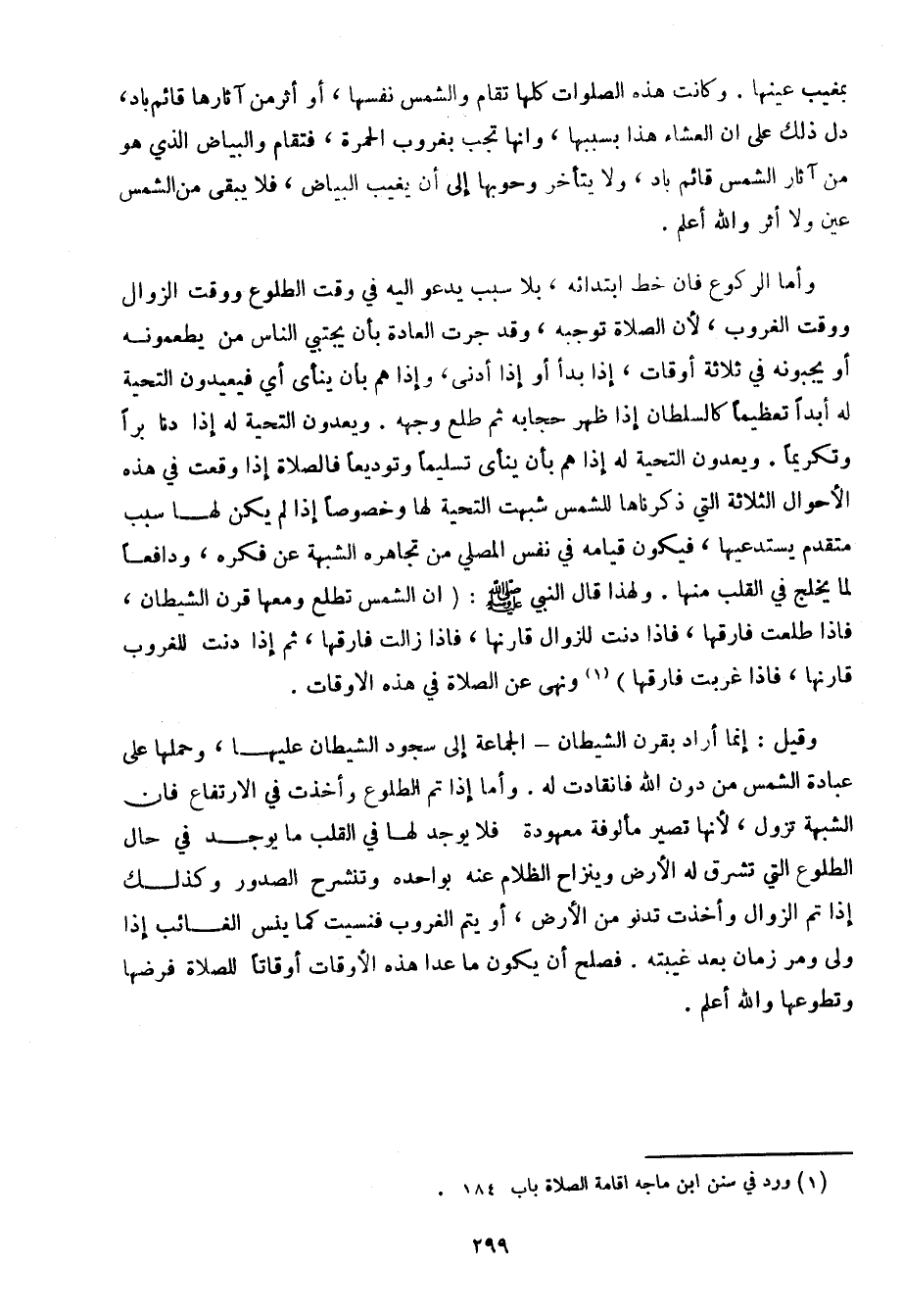 وقيل: إنما أراد بقرن الشيطان - الجماعة إلى سجود الشيطان عليها، وحملها على عبادة الشمس من دون الله فانقادت له. وأما إذا تم الطلوع وأخذت في الارتفاع فإن الشبهة تزول، لأنها تصير مألوفة معهودة فلا يوجد لها في القلب ما يوجد في حال الطلوع التي تشرف له الأرض وينزاح الظلام عنه بواحده وتنشرح الصدور وكذلك إذا تم الزوال وأخذت تدنو من الأرض، أو يتم الغروب فنسيت كما ينس الغائب إذا ولى ومر زمان بعد غيبته. فصلح أن يكون ما عدا هذه الأوقات أوقاتًا للصلاة فرضها وتطوعها والله أعلم.
