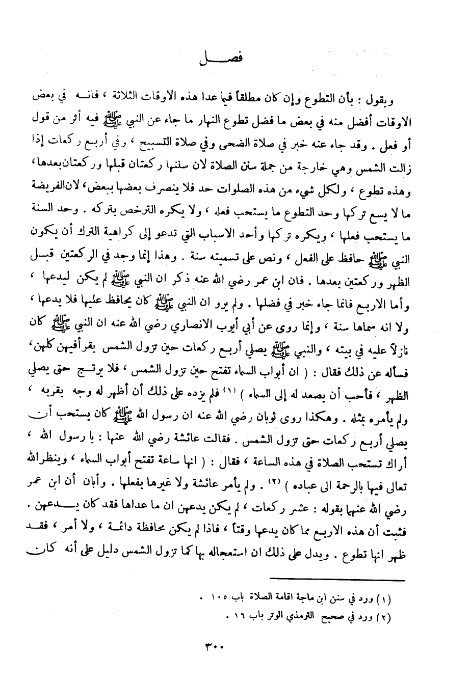 ويقول: بأن التطوع وإن كان مطلقًا فيما عدا هذه الأوقات الثلاثة، فإنه في بعض الأوقات أفضل منه في بعض ما فضل تطوع النهار ما جاء عن النبي صلى الله عليه وسلم فيه أثر من قول أو فعل. وقد جاء عنه خبر في صلاة الضحى وفي صلاة التسبيح، وفي أربع ركعات إذا زالت الشمس وهي خارجة من جملة سنن الصلاة لأن سننها ركعتان قبلها وركعتان بعدها، وهذه تطوع، ولكل شيء من هذه الصلوات حد فلا ينصرف بعضها ببعض، لأن الفريضة ما لا يسع تركها وحد التطوع ما يستحب فعله، ولا يكره الترخص بتركه. وحد السنة ما يستحب فعلها، ويكره تركها وأحد الأسباب التي تدعو إلى كراهية الترك أن يكون النبي صلى الله عليه وسلم حافظ على الفعل، ونص على تسميته سنة. وهذا إنما وجد في الركعتين قبل الظهر وركعتين بعدها. فإن ابن عمر رضي الله عنه ذكر أن النبي صلى الله عليه وسلم لم يكن ليدعها، وأما الأربع فإنما جاء خبر في فضلها. ولم يرو أن النبي صلى الله عليه وسلم كان يحافظ عليها فلا يدعها، ولا أنه سماها سنة، وإنما روى عن أبي أيوب الأنصاري رضي الله عنه أن النبي صلى الله عليه وسلم كان نازلاً عليه في بيته، والنبي صلى الله عليه وسلم يصلي أربع ركعات حين تزول الشمس يقرأ فيهن كلهن، فسأله عن ذلك فقال: (أن أبواب السماء تفتح حين تزول الشمس، فلا يرتج حتى يصلي الظهر، فأحب أن يصعد له إلى السماء) فلم يزده على ذلك أن أظهر له وجه يقربه، ولم يأمره بمثله. وهكذا روى ثوبان رضي الله عنه أن رسول الله صلى الله عليه وسلم كان يستحب أن يصلي أربع ركعات حتى تزول الشمس. فقالت عائشة رضي الله عنها: يا رسول الله، أراك تستحب الصلاة في هذه الساعة، فقال: (أنها ساعة تفتح أبواب السماء، وينظر الله تعالى فيها بالرحمة إلى عباده). ولم يأمر عائشة ولا غيرها بفعلها. وأبان أن ابن عمر رضي الله عنهما بقوله: عشر ركعات، لم يكن يدعهن أن ما عداها فقد كان يدعهن. فثبت أن هذه الأربع مما كان يدعها وقتًا، فإذا لم يكن محافظة دائمة، ولا أمر، فقد ظهر أنها تطوع. ويدل على ذلك أن استعجاله بها كما تزول الشمس دليل على أنه كان