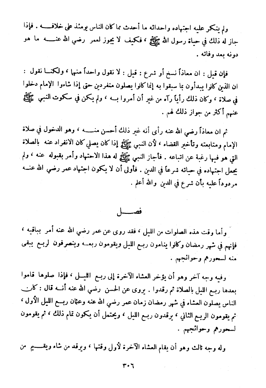 ثم إن معاذًا رضي الله عنه رأى أنه غير ذلك أحسن منه، وهو الدخول في صلاة الإمام ومتابعته وتأخير القضاء، لأن النبي صلى الله عليه وسلم إذا كان يصلي كان الإنفراد عنه بالصلاة التي هو فيها رغبة عن إتباعه. فأجاز النبي صلى الله عليه وسلم له هذا الاجتهاد وأمر بقبوله عنه، ولم يجعل اجتهاده في حياته شرعًا في الدين. فأولى أن لا يكون اجتهاد عمر رضي الله عنه مردودًا عليه بأن شرع في الدين والله أعلم.