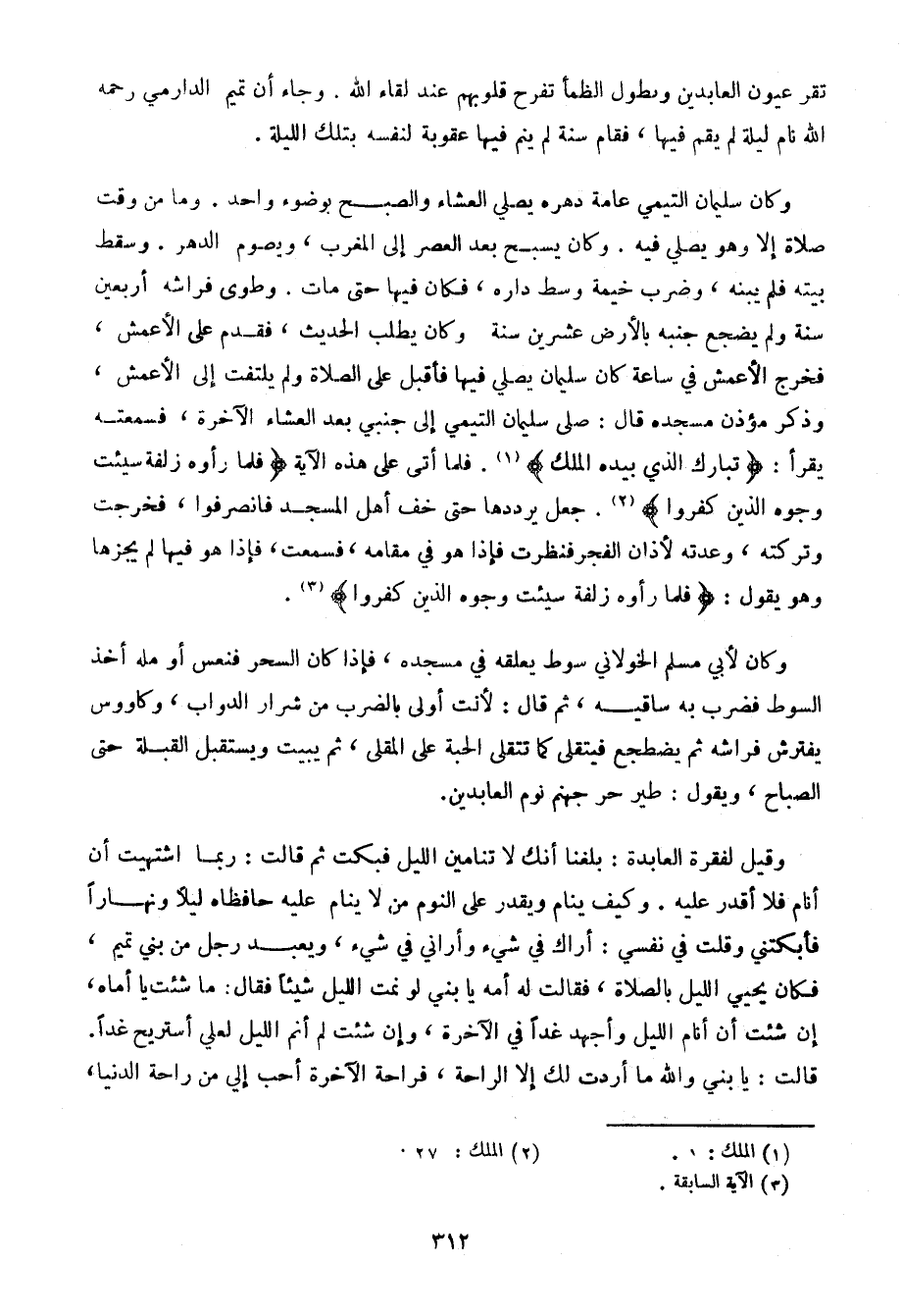 وكان سليمان التيمي عامة دهره يصلي العشاء والصبح بوضوء واحد. وما من وقت صلاة إلا وهو يصلي فيه. وكان يسبح بعد العصر إلى المغرب، ويصوم الدهر. وسقط بيته فلم يبنه، وضرب خيمة وسط داره، فكان فيها حتى مات. وطوى فراشه أربعين سنة ولم يضجع جنبه بالأرض عشرين سنة وكان يطلب الحديث، فقدم على الأعمش، فخرج الأعمش في ساعة كان سليمان يصلي فيها فأقبل على الصلاة ولم يلتفت إلى الأعمش، وذكر مؤذن مسجده قال: صلى سليمان التيمي إلى جنبي بعد العشاء الآخرة، فسمعته يقرأ:} تبارك الذي بيده الملك {. فلما أتى على هذه الآية} فلما رأوه زلفة سيئت وجوه الذين كفروا {. جعل يرددها حتى خف أهل المسجد فانصرفوا، فخرجت وتركته، وعدته لأذان الفجر فنظرت فإذا هو في مقامه، فسمعت، فإذا هو فيها لم يجزها وهو يقول:} فلما رأوه زلفة سيئت وجوه الذين كفروا {.