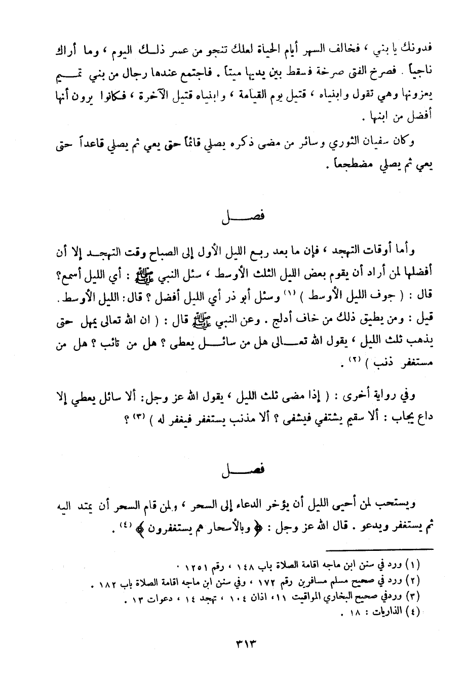 وأما أوقات التهجد، فإن ما بعد ربع الليل الأول إلى الصباح وقت التهجد إلا أن أفضلها لمن أراد أن يقوم بعض الليل الثلث الأوسط، سئل النبي صلى الله عليه وسلم: أي الليل أسمع؟ قال: (جوف الليل الأوسط) وسئل أبو ذر أي الليل أفضل؟ قال: الليل الأوسط. قيل: ومن يطيق ذلك من خاف أدلج. وعن النبي صلى الله عليه وسلم قال: (إن الله تعالى يمهل حتى يذهب ثلث الليل، يقول الله تعالى هل من سائل يعطى؟ هل من تائب؟ هل من مستغفر ذنب).
