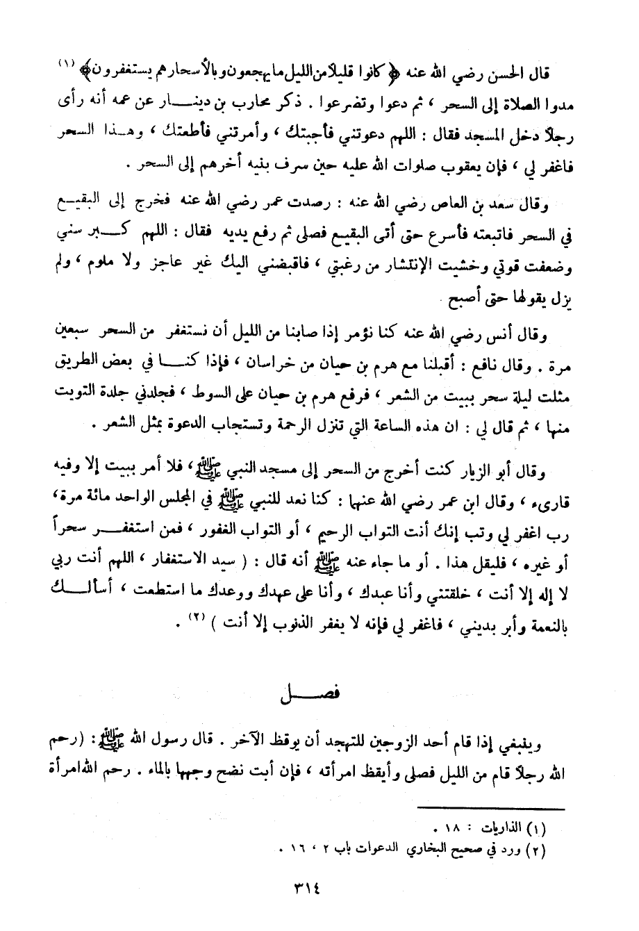 قال الحسن رضي الله عنه {كانوا قليلاً من الليل ما يهجعون وبالأسحار هم يستغفرون {مدوا الصلاة إلى السحر، ثم دعوا وتضرعوا. ذكر محارب بن دينار عن عمه أنه رأى رجلاً دخل المسجد فقال: اللهم دعوتني فأجبتك، وأمرتني فأطعتك، وهذا سحر فاغفر لي، فإن يعقوب صلوات الله عليه حين سرف بنيه أخرهم إلى السحر.