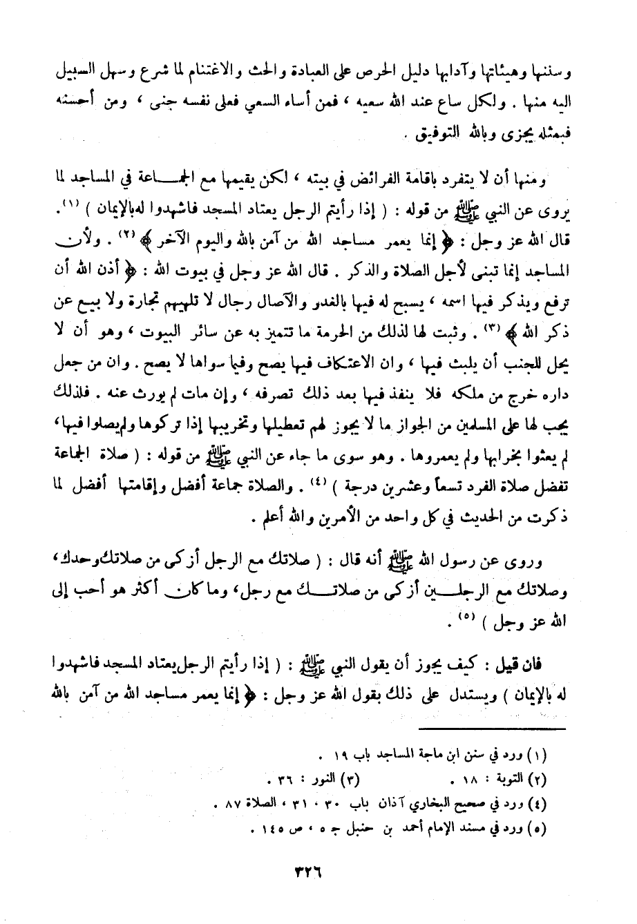 ومنها أن لا ينفرد بإقامة الفرائض في بيته، لكن يقيمها مع الجماعة في المساجد لما يروى عن النبي صلى الله عليه وسلم من قوله: (إذا رأيتم الرجل يعتاد المسجد فاشهدوا له بالإيمان). قال الله عز وجل: {إنما يعمر مساجد الله من آمن بالله واليوم الآخر}. ولأن المساجد إنما تبني لأجل الصلاة والذكر. قال الله عز وجل في بيوت الله: {أذن الله أن ترفع ويذكر فيها اسمه، يسبح له فيها بالغدو والآصال رجال لا تليهم تجارة ولا بيع عن ذكر الله}. وثبت لها لذلك من الحرمة ما تتميز به عن سائر البيوت، وهو أن لا يحل للجنب أن يلبث فيها، وإن الاعتكاف فيها يصح وفيما سواها لا يصح، وأن من جعل داره خرج من ملكه فلا ينفذ فيها بعد ذلك تصرفه، وإن مات لم يورث عنه. فلذلك يجب لها على المسلمين من الجواز ما لا يجوز لهم تعطيلها وتخريبها إذا تركوها ولم يصلوا فيها، لم يعثوا بخرابها ولم يعمروها. وهو سوى ما جاء عن النبي صلى الله عليه وسلم من قوله: (صلاة الجماعة تفضل صلاة الفرد تسعًا وعشرين درجة). والصلاة جماعة أفضل وإقامتها أفضل لما ذكرت من الحديث في كل واحد من الأمرين والله أعلم.