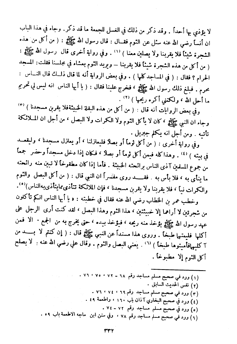 وخطب عمر بن الخطاب رضي الله عنه فقال في خطبته: "يا أيها الناس أنكم تأكلون من شجرتين لا أراهما إلا خبيثتين، هذا الثوم وهذا البصل، لقد كنت أرى الرجل على عهد رسول الله صلى الله عليه وسلم يؤخذ منه ريحه، فيؤخذ بيده، حتى يخرج به من الجمع. إلا فمن أكلها فليمتهما طبخًا. وروى هذا مسندًا عن النبي صلى الله عليه وسلم قال: (إن كنتم لابد من آكليهما فأميتوها طبخًا). يعني البصل والثوم. وقال علي رضي الله عنه: لا يصلح أكل الثوم إلا مطبوخًا.