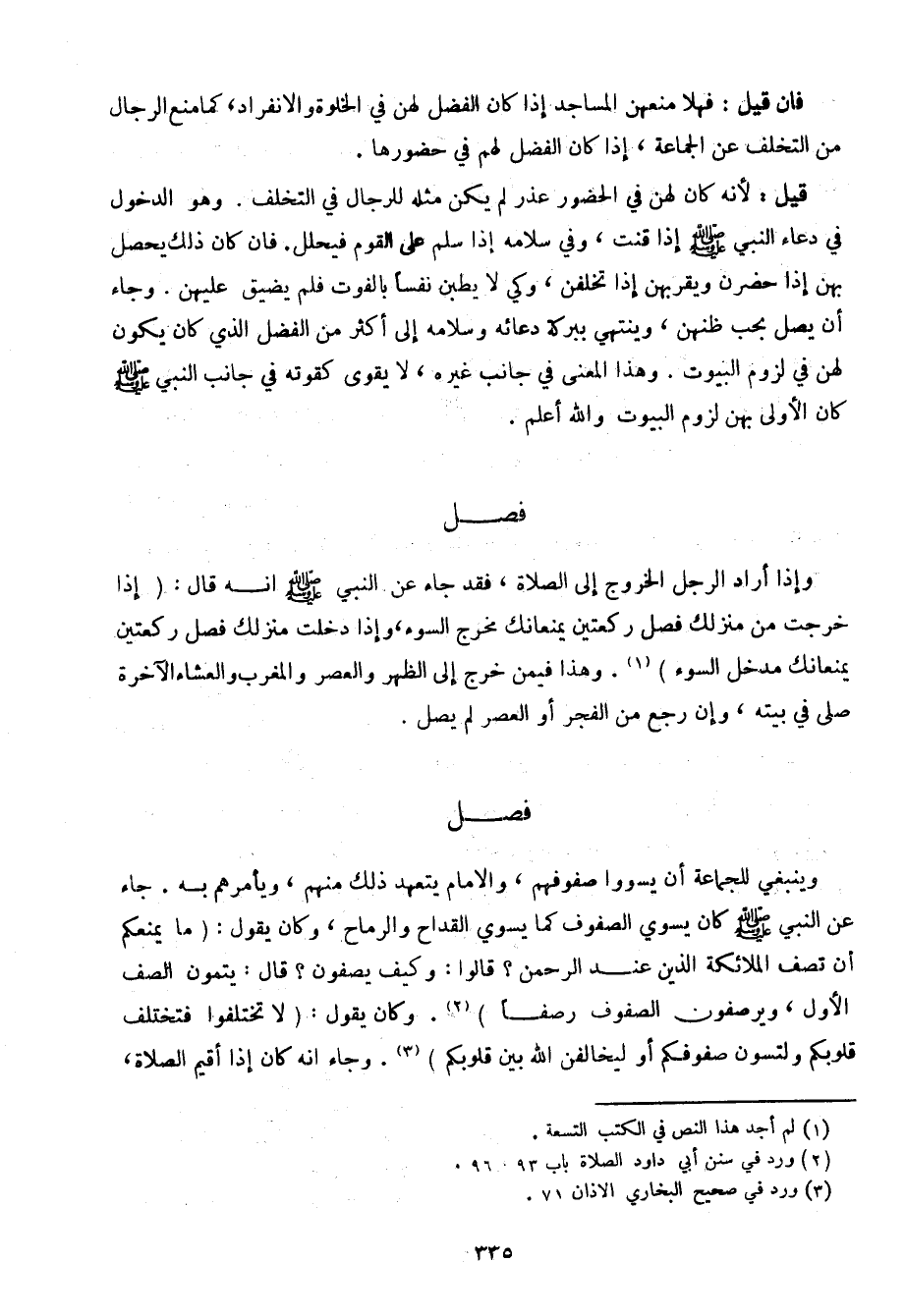 وينبغي للجماعة أن يسووا صفوفهم، والإمام يتعهد ذلك منهم، ويأمرهم به. جاء عن النبي صلى الله عليه وسلم كان يسوي الصفوف كما يسوي القداح والرماح، وكان يقول: (ما يمنعكم أن تصف الملائكة الذين عند الرحمن؟ قالوا: وكيف يصفون؟ قال: يتمون الصف الأول، ويرصفون الصفوف رصفًا). وكان يقول: (لا تختلفوا فتختلف قلوبكم ولتسون صفوفكم أو ليخالفن الله بين قلوبكم). وجاء أنه كان إذا أقيم الصلاة،