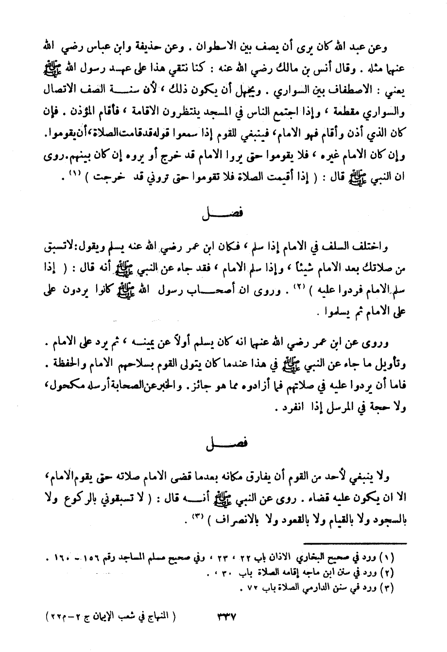 وعن عبد الله كان يرى أن يصف بين الاسطوان. وعن حذيفة وابن عباس رضي الله عنهما مثله. وقال أنس بن مالك رضي الله عنه: كنا نتقي هذا على عهد رسول الله صلى الله عليه وسلم يعني: الاصطفاف بين السواري. ويجهل أن يكون ذلك، لأن سنة الصف الاتصال والسواري مقطعة، وإذا اجتمع الناس في المسجد ينتظرون الإقامة، فأقام المؤذن. فإن كان الذي أذن وأقام فهو الإمام، فينبغي للقوم إذا سمعوا قوله قد قامت الصلاة، أن يقوموا. وإن كان الإمام غيره، فلا يقوموا حتى يروا الإمام قد خرج أو يروه إن كان بينهم. روى أن النبي صلى الله عليه وسلم قال: (إذا أقيمت الصلاة فلا تقوما حتى تروني قد خرجت).