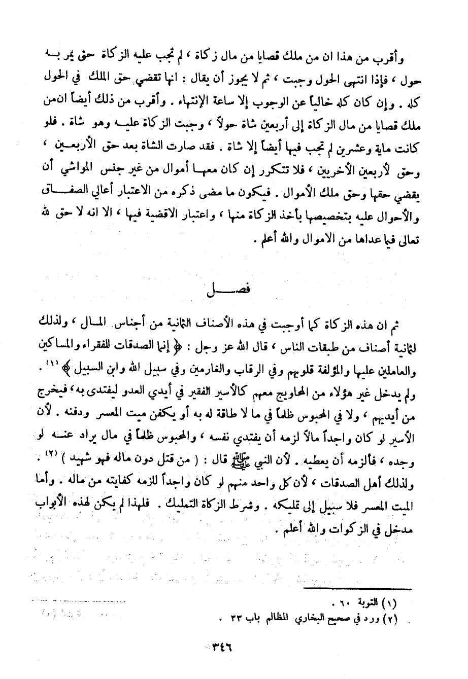 قم أن هذه الزكاة كما أوجبت في هذه الأصناف الثمانية من أجناس المال، ولذلك لثمانية أصناف من طبقات الناس، قال الله عز وجل: {إنما الصدقات للفقراء والمساكين والعاملين عليها والمؤلفة قلوبهم وفي الرقاب والغارمين وفي سبيل الله وابن السبيل). ولم يدخل غير هؤلاء من المحاويج معهم كالأسير الفقير في أيدي العدو ليفتدي به، فيخرج من أيديهم، ولا في المحبوس ظلمًا في ما لا طاقة له به أو يكفن ميت المعسر ودفنه. لأن الأسير لو كان واجدًا مالًا لزمه أن يفتدي نفسه، والمحبوس ظلمًا في مال يراد عنه لو وجده، فألزمه أن يعطيه. لأن النبي صلى الله عليه وسلم قال: (من قتل جون ماله فهو شهيد). ولذلك أهل الصدقات، لأن كل واحد منهم لو كان واجدًا كفايته من ماله. وأما الميت المعسر فلا سبيل إلى تمليكه. شرط الزكاة التمليك. فلهذا لم يكن لهذه الأبواب مدخل في الزكوات والله أعلم.