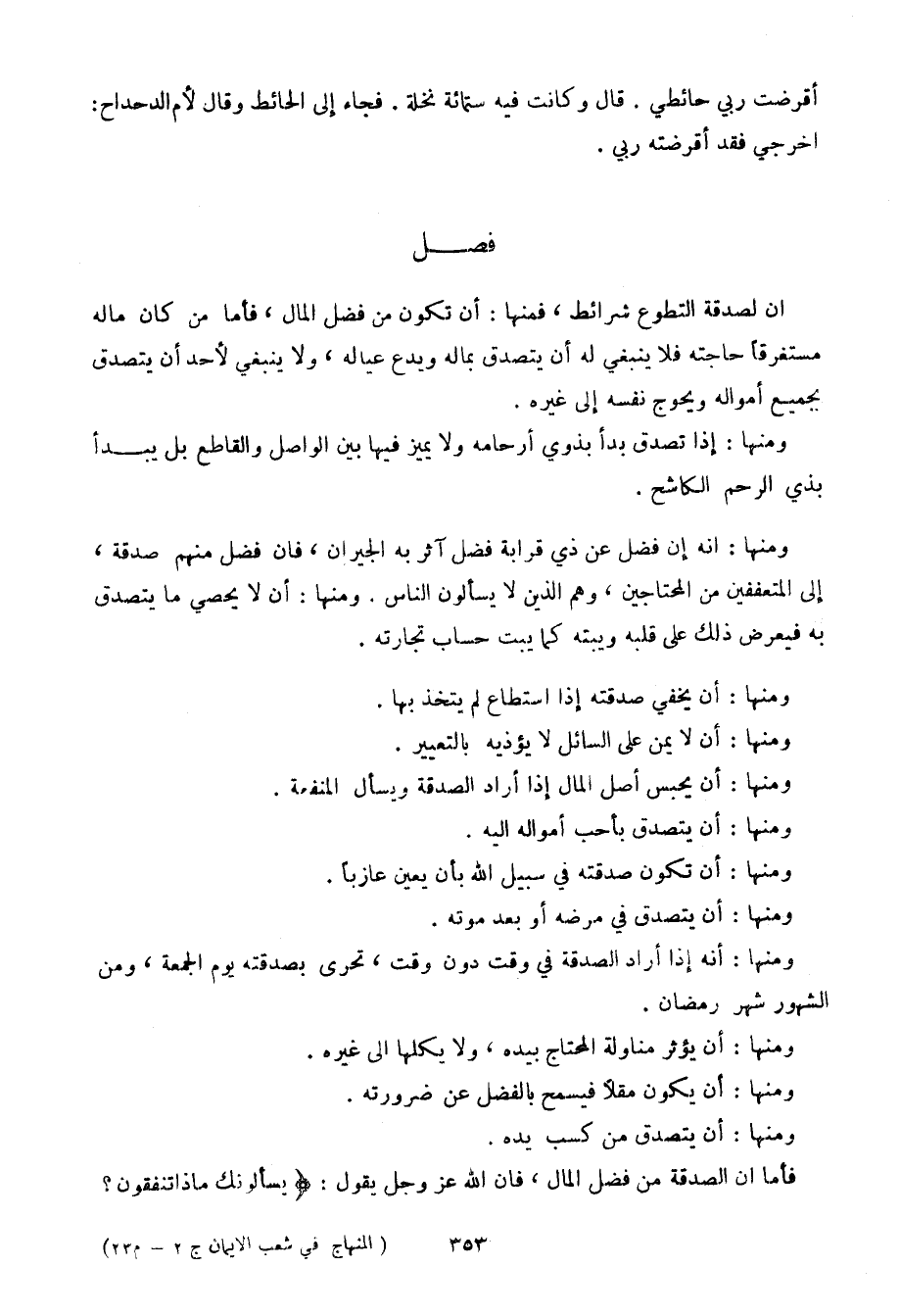 ومنها: أنه إن فضل عن ذي قرابة فضل آثر به الجيران، فإن فضل منهم صدقة، إلى المتعففين من المحتاجين، وهم الذين لا يسألون الناس. ومنها: أن لا يحصي ما يتصدق به فيعرض ذلك على قلبه ويبته كما يبت حساب تجارته.