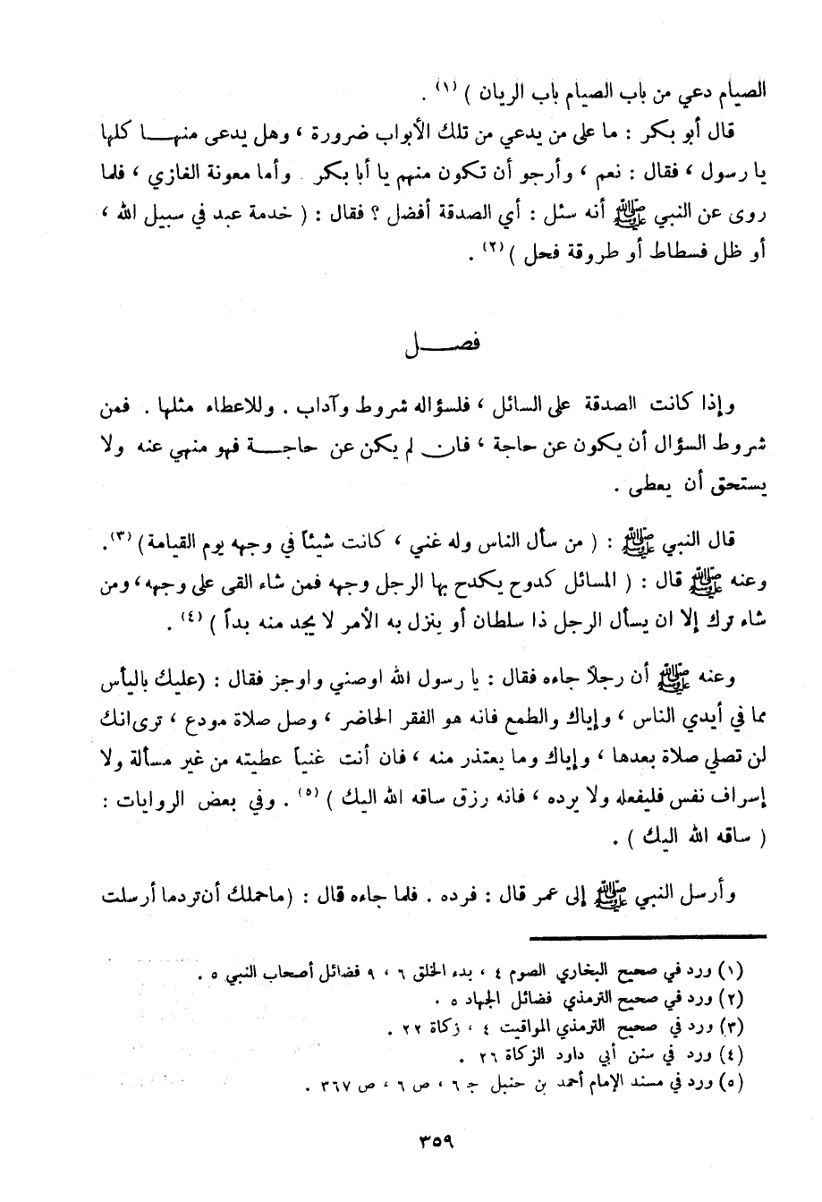 قال أبو بكر: ما على من يدعي من تلك الأبواب ضرورة، وهل يدعي منها كلها يا رسول، فقال: نعم، وأرجو أن تكون منهم يا أبا بكر. وأما معونة الغازي، فلما روى عن النبي صلى الله عليه وسلم أنه سئل: أي الصدقة أفضل؟ فقال: (خدمة عبد في سبيل الله، أو ظل فسطاط أو طروقة فحل).