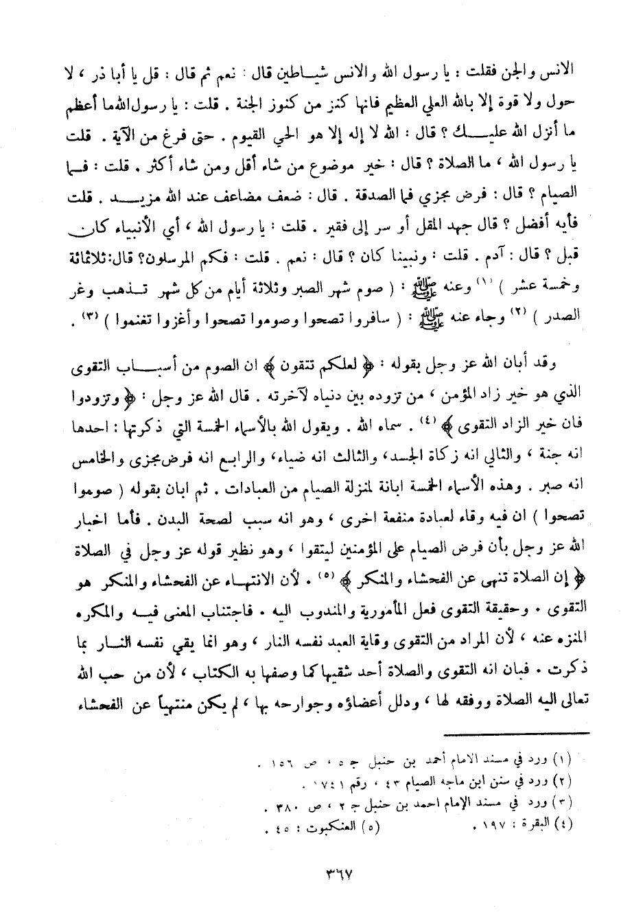 الإنس والجن فقلت: يا رسول الله والإنس شياطين قال: نعم ثم قال: قل يا أبا ذر، لا حول ولا قوة إلا بالله العلي العظيم فإنها كنز من كنوز الجنة. قلت: يا رسول الله ما أعظم ما أنزل الله عليك؟ قال: الله لا إله إلا هو الحي القيوم. حتى فرغ من الآية. قلت يا رسول الله، ما الصلاة؟ قال: خير موضوع من شاء أقل ومن شاء أكثر. قلت: فما الصيام؟ قال: فرض مجزي فما الصدقة. قال: ضعف مضاعف عند الله مزيد. قلت فأيه أفضل؟ قال جهد المقل أو سر إلى فقير. قلت: يا رسول الله، أي الأنبياء كان قبل؟ قال: آدم. قلت: ونبينا كان؟ قال: نعم. قلت: فكم المرسلون؟ قال: ثلاثمائة وخمسة عشر) وعنه صلى الله عليه وسلم: (صوم شهر الصبر وثلاثة أيام من كل شهر تذهب وغر الصدر) وجاء عنه صلى الله عليه وسلم: (سافروا تصحوا وصوموا تصحوا وأغزوا تغنموا).