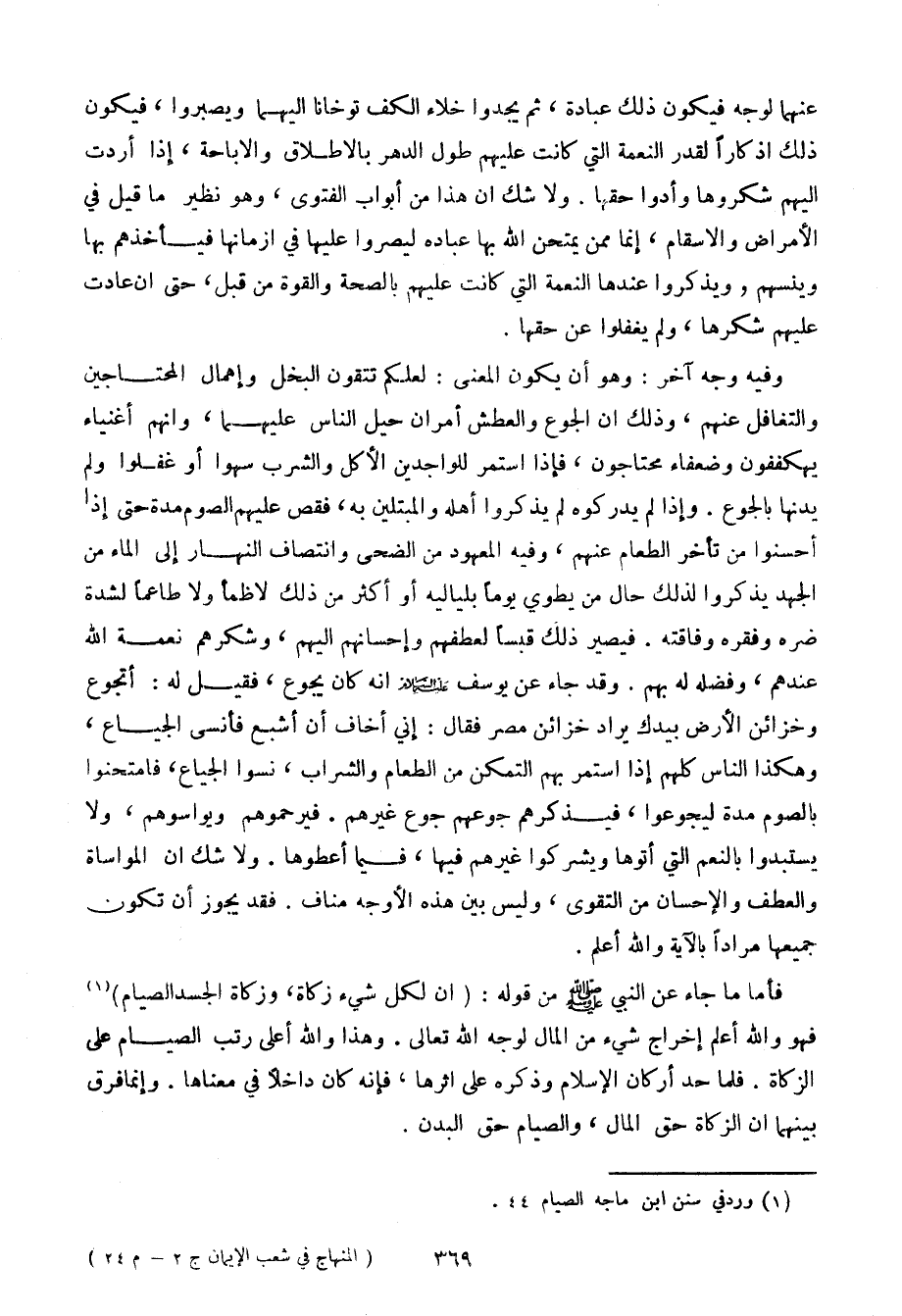 فأما ما جاء عن النبي صلى الله عليه وسلم من قوله: (إن لكل شيء زكاة، وزكاة الجسد الصيام) فهو والله أعلم إخراج شيء من المال لوجه الله تعالى. وهذا والله أعلى رتب الصيام على الزكاة. فلما حد أركان الإسلام وذكره على أثرها، فإنه كان داخلاً في معناها. وإنما فرق بينهما أن الزكاة حق المال، والصيام حق البدن.