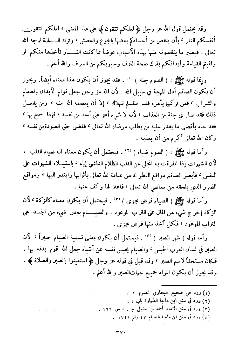 وأما قوله صلى الله عليه وسلم: (الصوم ضياء). فيحتمل أن يكون معناه أنه ضياء للقلب. لأن الشهوات إذا انفرقت به انجلى عن القلب الظلام الغاشي إياه، باستيلاء الشهوات على النفس، فأبصر الصائم مواقع النظر له من عبادة الله تعالى بأثوابها وابتدر إليها، ومواقع الضرر الذي يلحقه من معاصي الله تعالى، فاعتزلها وكف عنها.