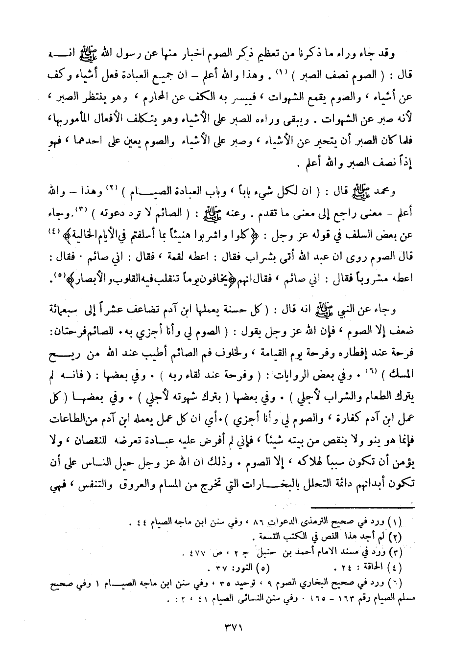 وجاء عن النبي صلى الله عليه وسلم أنه قال: (كل حسنة يعملها ابن آدم تضاعف عشرًا إلى سبعمائة ضعف إلا الصوم، فإن الله عز وجل يقول: (الصوم لي وأن أجزي به. للصائم فرحتان: فرحة عند إفطاره وفرحة يوم القيامة، ولخلوف فم الصائم أطيب عند الله من ريح المسك). وفي بعض الروايات: (وفرحة عند لقاء ربه). وفي بعضها: (فإنه لم يترك الطعام والشراب لأجلي). وفي بعضها (بترك شهوته لأجلي). وفي بعضها (كل عمل ابن آدم كفارة، والصوم لي وأنا أجزي). أي أن كل عمل يعمله ابن آدم من الطاعات فإنما هو ينو ولا ينقص من بيته شيئًا، فإني لم أفرض عليه عبادة تعرضه للنقصان، ولا يؤمن أن تكون سببًا لهلاكه، إلا الصوم. وذلك أن الله عز وجل حيل الناس على أن تكون أبدانهم دائمة التحلل بالبخارات التي تخرج من المسام والعروق والتنفس، فهي