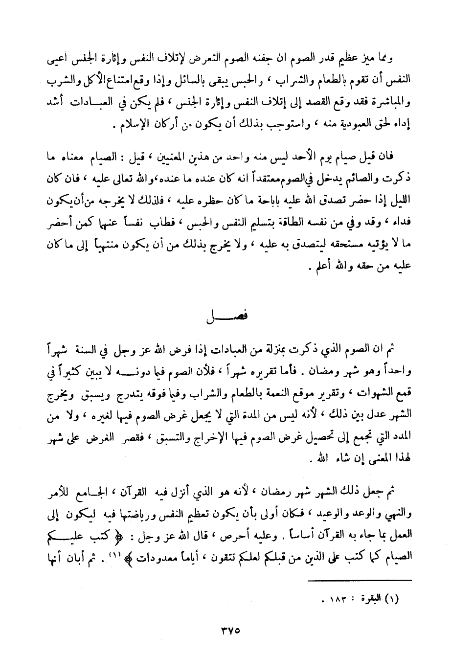 ثم جعل ذلك الشهر شهر رمضان، لأنه هو الذي أنزل فيه القرآن، الجامع للأمر والنهي والوعد والوعيد، فكان أولى بأن يكون تعظيم النفس ورياضتها فيه ليكون إلى العمل بما جاء به القرآن أساسًا. وعليه أحرص، قال الله عز وجل: {كتب عليكم الصيام كما كتب على الذين من قبلكم لعلكم تتقون، أيامًا معدودات}. ثم أبان أنها